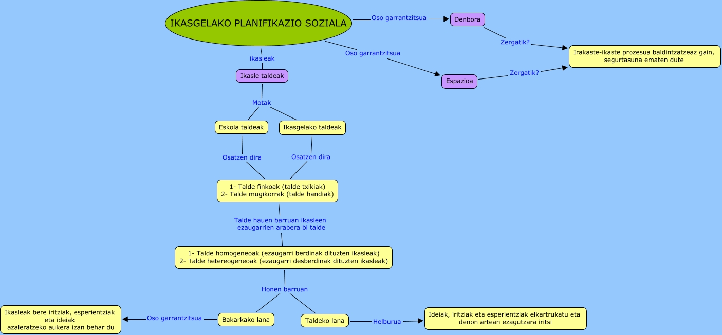 Este Cmap, tiene información relacionada con: nerea goya, maialen beitia eta meritxel etxagibel, Eskola taldeak Osatzen dira 1- Talde finkoak (talde txikiak) 2- Talde mugikorrak (talde handiak), Ikasle taldeak Motak Ikasgelako taldeak, Ikasle taldeak Motak Eskola taldeak, 1- Talde homogeneoak (ezaugarri berdinak dituzten ikasleak) 2- Talde hetereogeneoak (ezaugarri desberdinak dituzten ikasleak) Honen barruan Taldeko lana, Bakarkako lana Oso garrantzitsua Ikasleak bere iritziak, esperientziak eta ideiak azaleratzeko aukera izan behar du, IKASGELAKO PLANIFIKAZIO SOZIALA Oso garrantzitsua Espazioa, Espazioa Zergatik? Irakaste-ikaste prozesua baldintzatzeaz gain, segurtasuna ematen dute, IKASGELAKO PLANIFIKAZIO SOZIALA ikasleak Ikasle taldeak, IKASGELAKO PLANIFIKAZIO SOZIALA Oso garrantzitsua Denbora, Denbora Zergatik? Irakaste-ikaste prozesua baldintzatzeaz gain, segurtasuna ematen dute, 1- Talde finkoak (talde txikiak) 2- Talde mugikorrak (talde handiak) Talde hauen barruan ikasleen ezaugarrien arabera bi talde 1- Talde homogeneoak (ezaugarri berdinak dituzten ikasleak) 2- Talde hetereogeneoak (ezaugarri desberdinak dituzten ikasleak), Ikasgelako taldeak Osatzen dira 1- Talde finkoak (talde txikiak) 2- Talde mugikorrak (talde handiak), 1- Talde homogeneoak (ezaugarri berdinak dituzten ikasleak) 2- Talde hetereogeneoak (ezaugarri desberdinak dituzten ikasleak) Honen barruan Bakarkako lana, Taldeko lana Helburua Ideiak, iritziak eta esperientziak elkartrukatu eta denon artean ezagutzara iritsi