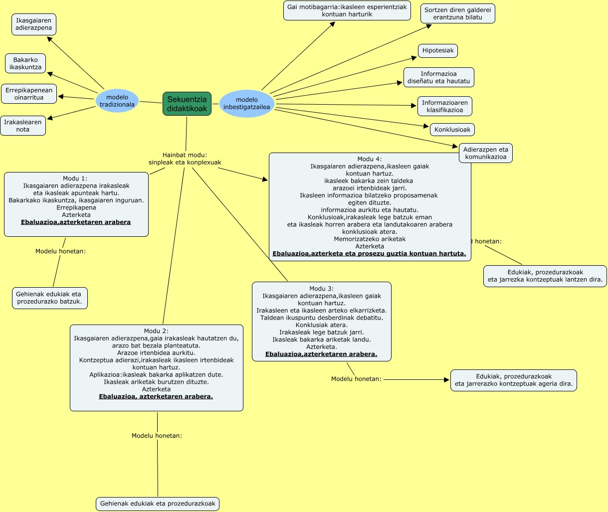 This Concept Map has information related to: T3.1 sEKUENTZIA DIDAKTIKOA Olatz alvarez, irune gurrrutxaga eta itxaso chocarro, Sekuentzia didaktikoak Hainbat modu: sinpleak eta konplexuak Modu 4: Ikasgaiaren adierazpena,ikasleen gaiak kontuan hartuz. ikasleek bakarka zein taldeka arazoei irtenbideak jarri. Ikasleen informazioa bilatzeko proposamenak egiten dituzte. informazioa aurkitu eta hautatu. Konklusioak,irakasleak lege batzuk eman eta ikasleak horren arabera eta landutakoaren arabera konklusioak atera. Memorizatzeko ariketak Azterketa Ebaluazioa,azterketa eta prosezu guztia kontuan hartuta., Sekuentzia didaktikoak modelo inbestigatzailea Hipotesiak, Modu 4: Ikasgaiaren adierazpena,ikasleen gaiak kontuan hartuz. ikasleek bakarka zein taldeka arazoei irtenbideak jarri. Ikasleen informazioa bilatzeko proposamenak egiten dituzte. informazioa aurkitu eta hautatu. Konklusioak,irakasleak lege batzuk eman eta ikasleak horren arabera eta landutakoaren arabera konklusioak atera. Memorizatzeko ariketak Azterketa Ebaluazioa,azterketa eta prosezu guztia kontuan hartuta. Modelu honetan: Edukiak, prozedurazkoak eta jarrezka kontzeptuak lantzen dira., Modu 3: Ikasgaiaren adierazpena,ikasleen gaiak kontuan hartuz. Irakasleen eta ikasleen arteko elkarrizketa. Taldean ikuspuntu desberdinak debatitu. Konklusiak atera. Irakasleak lege batzuk jarri. Ikasleak bakarka ariketak landu. Azterketa. Ebaluazioa,azterketaren arabera. Modelu honetan: Edukiak, prozedurazkoak eta jarrerazko kontzeptuak ageria dira., Sekuentzia didaktikoak modelo inbestigatzailea Informazioa diseñatu eta hautatu, Sekuentzia didaktikoak Hainbat modu: sinpleak eta konplexuak Modu 1: Ikasgaiaren adierazpena irakasleak eta ikasleak apunteak hartu. Bakarkako ikaskuntza, ikasgaiaren inguruan. Errepikapena Azterketa Ebaluazioa,azterketaren arabera, Sekuentzia didaktikoak modelo inbestigatzailea Sortzen diren galderei erantzuna bilatu, Sekuentzia didaktikoak modelo inbestigatzailea Konklusioak, Sekuentzia didaktikoak modelo inbestigatzailea Gai motibagarria:ikasleen esperientziak kontuan harturik, Sekuentzia didaktikoak modelo tradizionala Bakarko ikaskuntza
