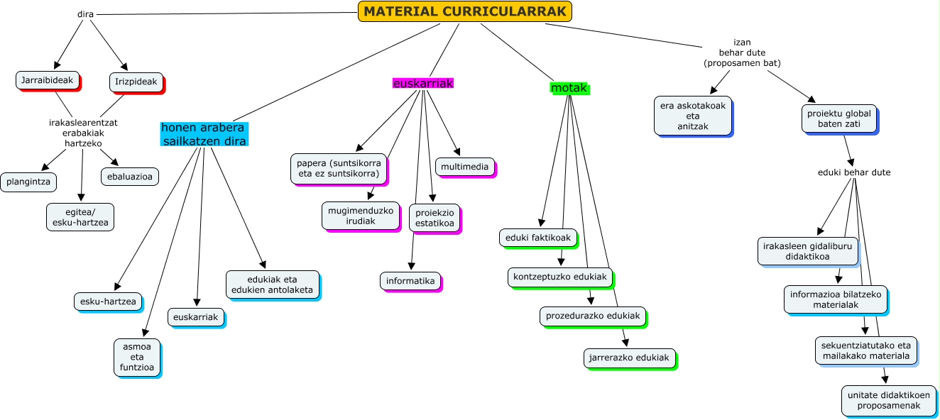Este Cmap, tiene información relacionada con: T.3.2. Material Curricularrak, MATERIAL CURRICULARRAK euskarriak informatika, proiektu global baten zati eduki behar dute sekuentziatutako eta mailakako materiala, MATERIAL CURRICULARRAK euskarriak multimedia, MATERIAL CURRICULARRAK euskarriak papera (suntsikorra eta ez suntsikorra), MATERIAL CURRICULARRAK euskarriak mugimenduzko irudiak, proiektu global baten zati eduki behar dute informazioa bilatzeko materialak, MATERIAL CURRICULARRAK motak jarrerazko edukiak, MATERIAL CURRICULARRAK honen arabera sailkatzen dira esku-hartzea, MATERIAL CURRICULARRAK dira Irizpideak, Jarraibideak irakaslearentzat erabakiak hartzeko plangintza, Irizpideak irakaslearentzat erabakiak hartzeko egitea/ esku-hartzea, proiektu global baten zati eduki behar dute unitate didaktikoen proposamenak, MATERIAL CURRICULARRAK honen arabera sailkatzen dira asmoa eta funtzioa, MATERIAL CURRICULARRAK motak prozedurazko edukiak, MATERIAL CURRICULARRAK izan behar dute (proposamen bat) proiektu global baten zati, MATERIAL CURRICULARRAK euskarriak proiekzio estatikoa, MATERIAL CURRICULARRAK honen arabera sailkatzen dira edukiak eta edukien antolaketa, Irizpideak irakaslearentzat erabakiak hartzeko ebaluazioa, Jarraibideak irakaslearentzat erabakiak hartzeko egitea/ esku-hartzea, MATERIAL CURRICULARRAK motak kontzeptuzko edukiak