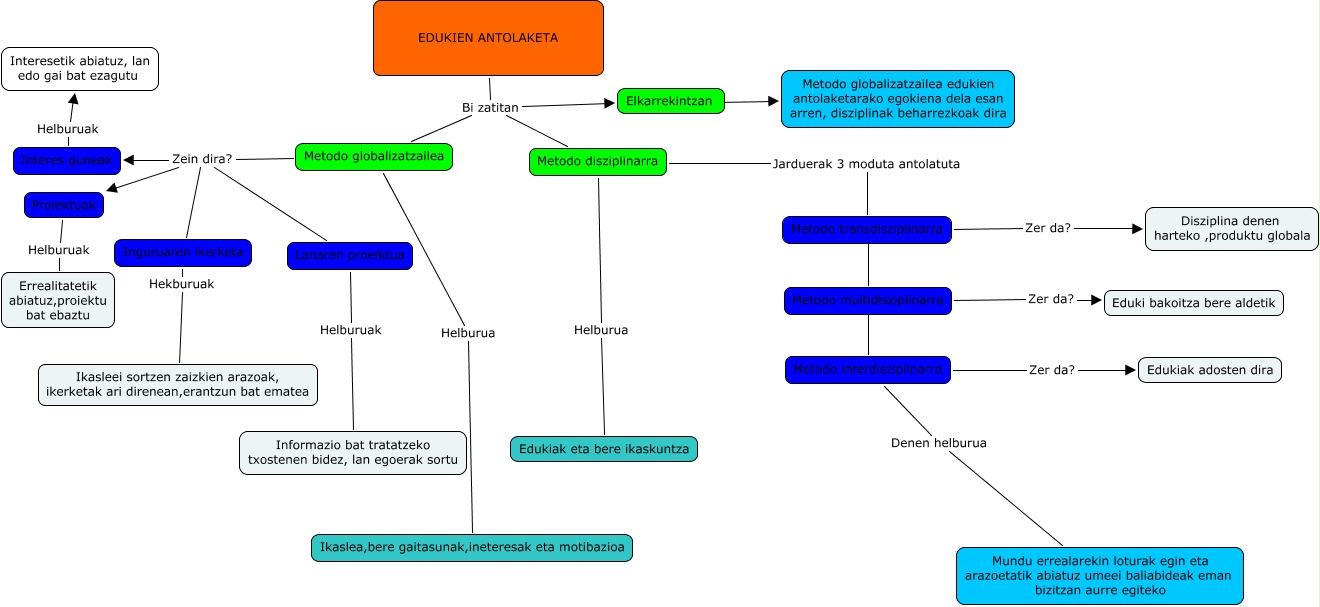 This Concept Map has information related to: t. 3.10 edukien antolaketa, Metodo globalizatzailea Zein dira? Interes guneak, Elkarrekintzan ???? Metodo globalizatzailea edukien antolaketarako egokiena dela esan arren, disziplinak beharrezkoak dira, Metodo globalizatzailea Zein dira? Lanaren proeiktua, Metodo transdisziplinarra ???? Metodo multidisziplinarra, EDUKIEN ANTOLAKETA Bi zatitan Metodo globalizatzailea, EDUKIEN ANTOLAKETA Bi zatitan Elkarrekintzan, Metodo globalizatzailea Helburua Ikaslea,bere gaitasunak,ineteresak eta motibazioa, Metodo multidisziplinarra ???? Metodo interdisziplinarra, Metodo disziplinarra Helburua Edukiak eta bere ikaskuntza, Metodo globalizatzailea Zein dira? Proiektuak
