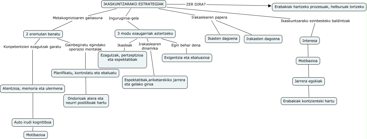 This Concept Map has information related to: T3.10 Ikaskuntzako estrategiak(Amaia eta Aitzol), Motibazioa ???? Jarrera egokiak, IKASKUNTZARAKO ESTRATEGIAK ZER DIRA? Erabakiak hartzeko prozesuak, helburuak lortzeko, IKASKUNTZARAKO ESTRATEGIAK Ingurugiroa-gela 3 modu ezaugarriak aztertzeko, 3 modu ezaugarriak aztertzeko Irakaslearen dinamika Espektatibak,ariketarekiko jarrera eta gelako giroa, IKASKUNTZARAKO ESTRATEGIAK Metakognizioaren gaitasuna 2 eremutan banatu, 2 eremutan banatu Gainbegiratu egindako operazio mentalak Planifikatu, kontrolatu eta ebaluatu, IKASKUNTZARAKO ESTRATEGIAK Irakaslearen papera Ikasten dagoena, 3 modu ezaugarriak aztertzeko Ikasleak Ezagutzak, pertzeptzioa eta espektatibak, Jarrera egokiak ???? Erabakiak kontzienteki hartu, 2 eremutan banatu Konpetentzien ezagutzak garatu Atentzioa, memoria eta ulermena