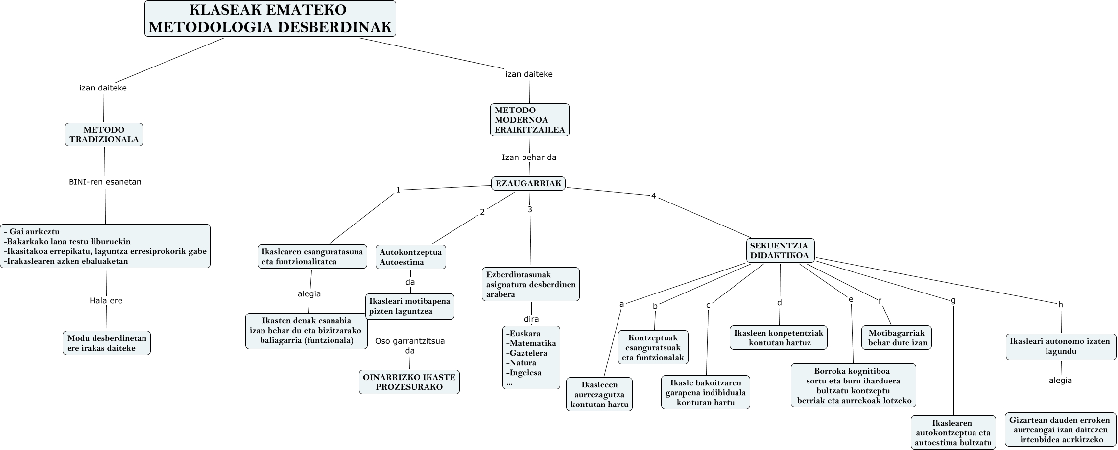 This Concept Map has information related to: T3-10 sekuentzia didaktikoak eta kontzeptu sekuentziak, SEKUENTZIA DIDAKTIKOA c Ikasle bakoitzaren garapena indibiduala kontutan hartu, Autokontzeptua Autoestima da Ikasleari motibapena pizten laguntzea, EZAUGARRIAK 1 Ikaslearen esanguratasuna eta funtzionalitatea, Ikasleari motibapena pizten laguntzea Oso garrantzitsua da OINARRIZKO IKASTE PROZESURAKO, - Gai aurkeztu -Bakarkako lana testu liburuekin -Ikasitakoa errepikatu, laguntza erresiprokorik gabe -Irakaslearen azken ebaluaketan Hala ere Modu desberdinetan ere irakas daiteke, KLASEAK EMATEKO METODOLOGIA DESBERDINAK izan daiteke METODO MODERNOA ERAIKITZAILEA, Ikasleari autonomo izaten lagundu alegia Gizartean dauden erroken aurreangai izan daitezen irtenbidea aurkitzeko, METODO MODERNOA ERAIKITZAILEA Izan behar da EZAUGARRIAK, Ikaslearen esanguratasuna eta funtzionalitatea alegia Ikasten denak esanahia izan behar du eta bizitzarako baliagarria (funtzionala), SEKUENTZIA DIDAKTIKOA g Ikaslearen autokontzeptua eta autoestima bultzatu