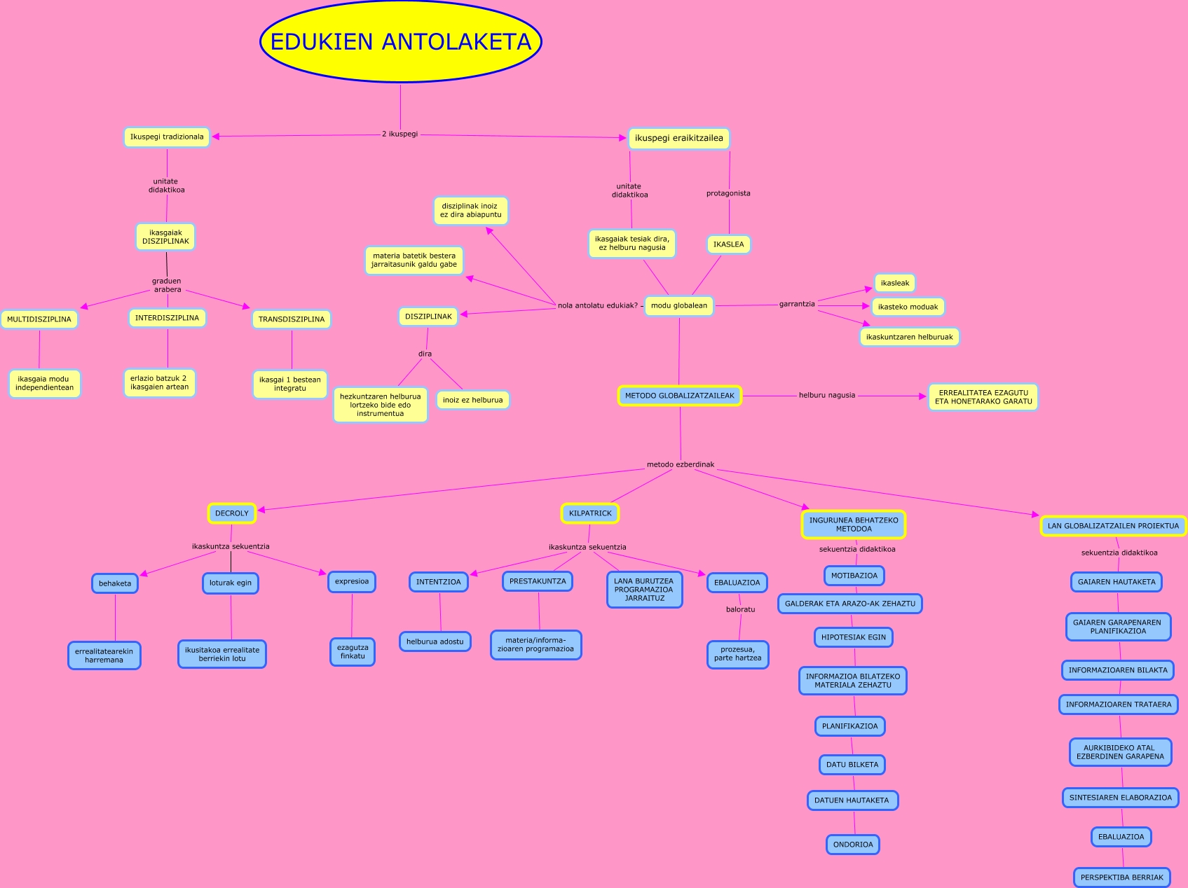 This Concept Map has information related to: Maria, Janire, Maria, Lierni (edukien antolaketa), KILPATRICK ikaskuntza sekuentzia EBALUAZIOA, INTERDISZIPLINA ???? erlazio batzuk 2 ikasgaien artean, ikasgaiak tesiak dira, ez helburu nagusia ???? modu globalean, LAN GLOBALIZATZAILEN PROIEKTUA sekuentzia didaktikoa GAIAREN HAUTAKETA, KILPATRICK ikaskuntza sekuentzia PRESTAKUNTZA, TRANSDISZIPLINA ???? ikasgai 1 bestean integratu, IKASLEA ???? modu globalean, METODO GLOBALIZATZAILEAK metodo ezberdinak DECROLY, EDUKIEN ANTOLAKETA 2 ikuspegi ikuspegi eraikitzailea, SINTESIAREN ELABORAZIOA ???? EBALUAZIOA