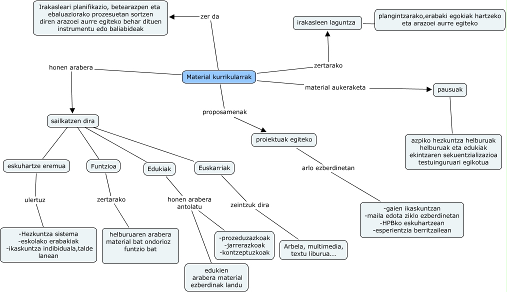 This Concept Map has information related to: material kurrikularrak(Jone Larrea, Amets Petralanda, Jon Arando eta Iñigo Madrazo), Edukiak honen arabera antolatu edukien arabera material ezberdinak landu, Material kurrikularrak zertarako irakasleen laguntza, Material kurrikularrak proposamenak proiektuak egiteko, proiektuak egiteko arlo ezberdinetan -gaien ikaskuntzan -maila edota ziklo ezberdinetan -HPBko eskuhartzean -esperientzia berritzailean, Funtzioa zertarako helburuaren arabera material bat ondorioz funtzio bat, pausuak ???? azpiko hezkuntza helburuak helburuak eta edukiak ekintzaren sekuentzializazioa testuinguruari egikotua, sailkatzen dira ???? Funtzioa, irakasleen laguntza ???? plangintzarako,erabaki egokiak hartzeko eta arazoei aurre egiteko, sailkatzen dira ???? Euskarriak, Edukiak honen arabera antolatu -prozeduzazkoak -jarrerazkoak -kontzeptuzkoak