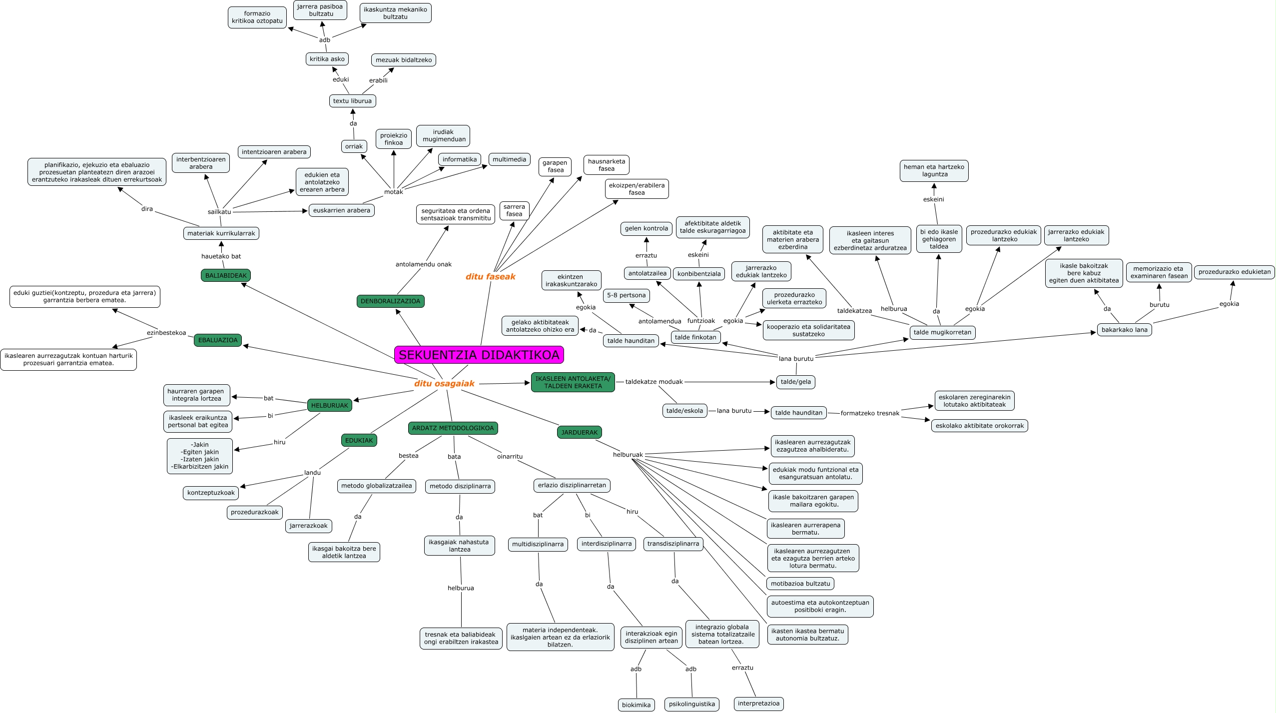 This Concept Map has information related to: t.3.9 (maddi, agurtzane eta pello), integrazio globala sistema totalizatzaile batean lortzea. erraztu interpretazioa, talde mugikorretan helburua ikasleen interes eta gaitasun ezberdinetaz arduratzea, bakarkako lana da ikasle bakoitzak bere kabuz egiten duen aktibitatea, talde finkotan funtzioak konbibentziala, euskarrien arabera motak irudiak mugimenduan, SEKUENTZIA DIDAKTIKOA ditu faseak sarrera fasea, SEKUENTZIA DIDAKTIKOA ditu osagaiak ARDATZ METODOLOGIKOA, ARDATZ METODOLOGIKOA bestea metodo globalizatzailea, talde mugikorretan taldekatzea aktibitate eta materien arabera ezberdina, talde/eskola lana burutu talde haunditan