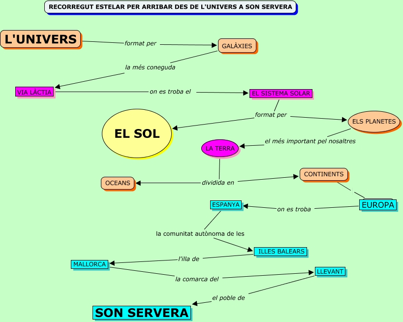 Este Cmap, tiene información relacionada con: SON SERVERA I L'UNIVERS 2, LA TERRA dividida en OCEANS, L'UNIVERS format per GALÀXIES, EUROPA on es troba ESPANYA, ELS PLANETES el més important pel nosaltres LA TERRA, MALLORCA la comarca del LLEVANT, EL SISTEMA SOLAR format per EL SOL, LA TERRA dividida en CONTINENTS, GALÀXIES la més coneguda VIA LÀCTIA, ILLES BALEARS l'illa de MALLORCA, LLEVANT el poble de SON SERVERA, CONTINENTS EUROPA, EL SISTEMA SOLAR format per ELS PLANETES, ESPANYA la comunitat autònoma de les ILLES BALEARS, VIA LÀCTIA on es troba el EL SISTEMA SOLAR