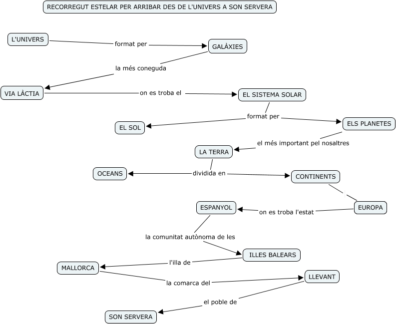 Este Cmap, tiene información relacionada con: SON SERVERA I L'UNIVERS 1, LA TERRA dividida en OCEANS, L'UNIVERS format per GALÀXIES, EUROPA on es troba l'estat ESPANYOL, MALLORCA la comarca del LLEVANT, ELS PLANETES el més important pel nosaltres LA TERRA, LA TERRA dividida en CONTINENTS, EL SISTEMA SOLAR format per EL SOL, ILLES BALEARS l'illa de MALLORCA, GALÀXIES la més coneguda VIA LÀCTIA, LLEVANT el poble de SON SERVERA, EL SISTEMA SOLAR format per ELS PLANETES, CONTINENTS EUROPA, ESPANYOL la comunitat autònoma de les ILLES BALEARS, VIA LÀCTIA on es troba el EL SISTEMA SOLAR