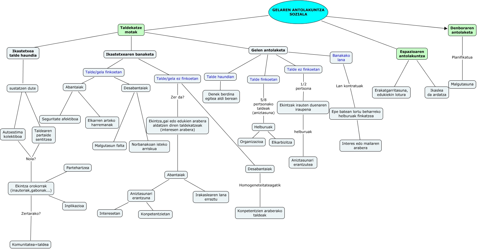 Este Cmap, tiene información relacionada con: Lierni,Maria M.,Maria L. eta Janire (Gelaren antolakuntza soziala), Ikastetxea talde haundia Taldearen partaide sentitzea, Helburuak ???? Elkarbizitza, Talde haundian ???? Denek berdina egitea aldi berean, Ikastetxearen banaketa ???? Talde/gela ez finkoetan, Talde finkoetan 5/8 pertsonako taldeak (aniztasuna) Helburuak, Desabantaiak Homogeneteitateagatik Konpetentzien araberako taldeak, Gelen antolaketa ???? Talde haundian, Talde/gela finkoetan ???? Desabantaiak, GELAREN ANTOLAKUNTZA SOZIALA ???? Espazioaren antolakuntza, Abantaiak ???? Seguritate afektiboa, GELAREN ANTOLAKUNTZA SOZIALA ???? Taldekatze motak, Abantaiak ???? Irakaslearen lana erraztu, Taldearen partaide sentitzea Nola? Ekintza orokorrak (inauteriak,gabonak...), Ekintza,gai edo edukien arabera aldatzen diren taldekatzeak (interesen arabera) ???? Abantaiak, Abantaiak ???? Aniztasunari erantzuna, GELAREN ANTOLAKUNTZA SOZIALA ???? Denboraren antolaketa, Taldekatze motak ???? Ikastetxearen banaketa, Autoestima kolektiboa Nola? Ekintza orokorrak (inauteriak,gabonak...), Ikastetxearen banaketa ???? Talde/gela finkoetan, Ekintza orokorrak (inauteriak,gabonak...) ???? Inplikazioa
