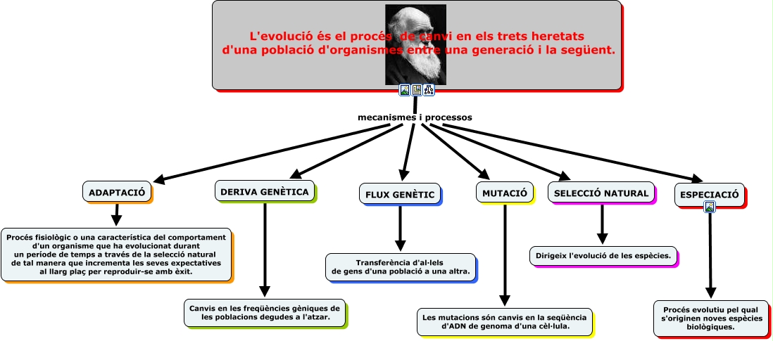 Este Cmap, tiene información relacionada con: EVOLUCIÓ, L'evolució és el procés de canvi en els trets heretats d'una població d'organismes entre una generació i la següent. mecanismes i processos ADAPTACIÓ, ESPECIACIÓ Procés evolutiu pel qual s'originen noves espècies biològiques., ADAPTACIÓ Procés fisiològic o una característica del comportament d'un organisme que ha evolucionat durant un període de temps a través de la selecció natural de tal manera que incrementa les seves expectatives al llarg plaç per reproduir-se amb èxit., L'evolució és el procés de canvi en els trets heretats d'una població d'organismes entre una generació i la següent. mecanismes i processos FLUX GENÈTIC, L'evolució és el procés de canvi en els trets heretats d'una població d'organismes entre una generació i la següent. mecanismes i processos SELECCIÓ NATURAL, L'evolució és el procés de canvi en els trets heretats d'una població d'organismes entre una generació i la següent. mecanismes i processos DERIVA GENÈTICA, DERIVA GENÈTICA Canvis en les freqüències gèniques de les poblacions degudes a l'atzar., L'evolució és el procés de canvi en els trets heretats d'una població d'organismes entre una generació i la següent. mecanismes i processos ESPECIACIÓ, SELECCIÓ NATURAL Dirigeix l'evolució de les espècies., L'evolució és el procés de canvi en els trets heretats d'una població d'organismes entre una generació i la següent. mecanismes i processos MUTACIÓ, MUTACIÓ Les mutacions són canvis en la seqüència d'ADN de genoma d'una cèl·lula., FLUX GENÈTIC Transferència d'al·lels de gens d'una població a una altra.