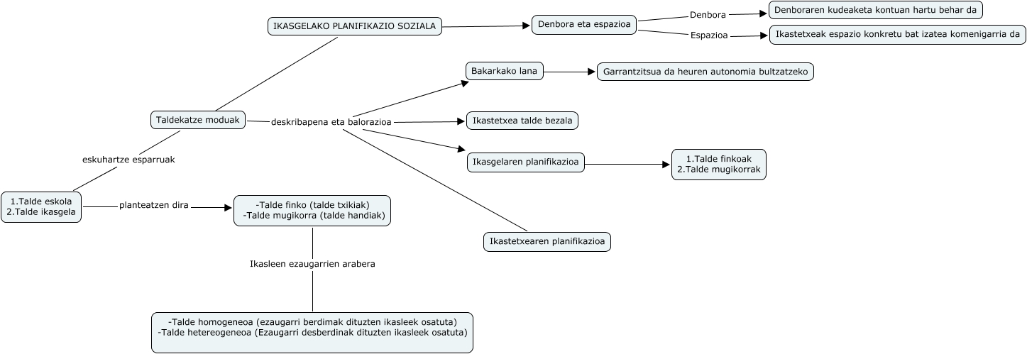 This Concept Map has information related to: 2. gaxe (nerea-5) berrixe, Taldekatze moduak deskribapena eta balorazioa Ikasgelaren planifikazioa, Denbora eta espazioa Espazioa Ikastetxeak espazio konkretu bat izatea komenigarria da, Taldekatze moduak deskribapena eta balorazioa Ikastetxearen planifikazioa, 1.Talde eskola 2.Talde ikasgela planteatzen dira -Talde finko (talde txikiak) -Talde mugikorra (talde handiak), Taldekatze moduak eskuhartze esparruak 1.Talde eskola 2.Talde ikasgela, -Talde finko (talde txikiak) -Talde mugikorra (talde handiak) Ikasleen ezaugarrien arabera -Talde homogeneoa (ezaugarri berdimak dituzten ikasleek osatuta) -Talde hetereogeneoa (Ezaugarri desberdinak dituzten ikasleek osatuta), Bakarkako lana ???? Garrantzitsua da heuren autonomia bultzatzeko, Denbora eta espazioa Denbora Denboraren kudeaketa kontuan hartu behar da, Taldekatze moduak deskribapena eta balorazioa Ikastetxea talde bezala, IKASGELAKO PLANIFIKAZIO SOZIALA ???? Denbora eta espazioa
