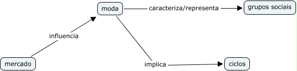 Esse mapa conceitual, produzido no IHMC CmapTools, tem a informação relacionada a: Mapa1 - Eliana, moda caracteriza/representa grupos sociais, mercado influencia moda, moda implica ciclos