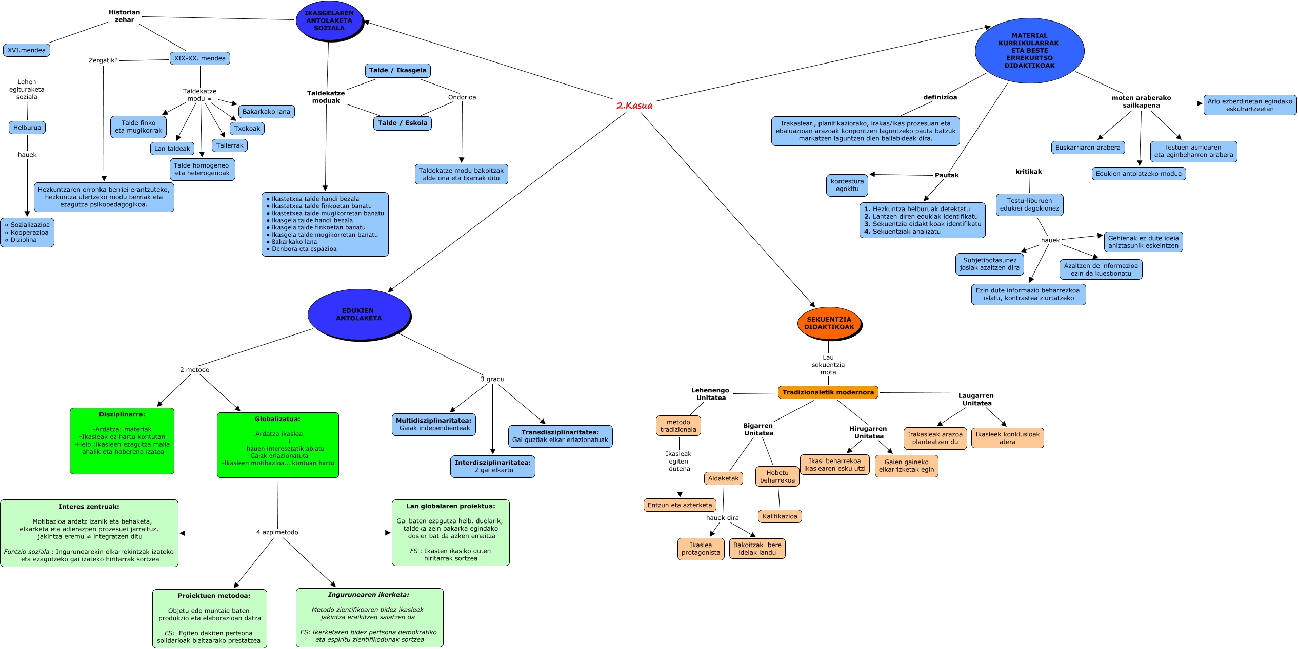 Este Cmap, tiene información relacionada con: Ander Retolaza_Aitziber Soriano_Nora Yugueros, EDUKIEN ANTOLAKETA 3 gradu Transdisziplinaritatea: Gai guztiak elkar erlazionatuak, MATERIAL KURRIKULARRAK ETA BESTE ERREKURTSO DIDAKTIKOAK moten araberako sailkapena Euskarriaren arabera, XIX-XX. mendea Taldekatze modu ≠ Tailerrak, IKASGELAREN ANTOLAKETA SOZIALA Taldekatze moduak Talde / Eskola, Aldaketak hauek dira Ikaslea protagonista, IKASGELAREN ANTOLAKETA SOZIALA Taldekatze moduak ∙ Ikastetxea talde handi bezala ∙ Ikastetxea talde finkoetan banatu ∙ Ikastetxea talde mugikorretan banatu ∙ Ikasgela talde handi bezala ∙ Ikasgela talde finkoetan banatu ∙ Ikasgela talde mugikorretan banatu ∙ Bakarkako lana ∙ Denbora eta espazioa, Tradizionaletik modernora Hirugarren Unitatea Ikasi beharrekoa ikaslearen esku utzi, Globalizatua: -Ardatza ikaslea ↓ hauen interesetatik abiatu -Gaiak erlazionatuta -Ikasleen motibazioa... kontuan hartu 4 azpimetodo Ingurunearen ikerketa: Metodo zientifikoaren bidez ikasleek jakintza eraikitzen saiatzen da FS:Ikerketaren bidez pertsona demokratiko eta espiritu zientifikodunak sortzea, Tradizionaletik modernora Laugarren Unitatea Irakasleak arazoa planteatzen du, Globalizatua: -Ardatza ikaslea ↓ hauen interesetatik abiatu -Gaiak erlazionatuta -Ikasleen motibazioa... kontuan hartu 4 azpimetodo Interes zentruak: Motibazioa ardatz izanik eta behaketa, elkarketa eta adierazpen prozesuei jarraituz, jakintza eremu ≠ integratzen ditu Funtzio soziala: Ingurunearekin elkarrekintzak izateko eta ezagutzeko gai izateko hiritarrak sortzea, MATERIAL KURRIKULARRAK ETA BESTE ERREKURTSO DIDAKTIKOAK Pautak kontestura egokitu, Tradizionaletik modernora Hirugarren Unitatea Gaien gaineko elkarrizketak egin, IKASGELAREN ANTOLAKETA SOZIALA Historian zehar XIX-XX. mendea, Testu-liburuen edukiei dagokionez hauek Gehienak ez dute ideia aniztasunik eskeintzen, EDUKIEN ANTOLAKETA 3 gradu Interdisziplinaritatea: 2 gai elkartu, MATERIAL KURRIKULARRAK ETA BESTE ERREKURTSO DIDAKTIKOAK Pautak 1. Hezkuntza helburuak detektatu 2. Lantzen diren edukiak identifikatu 3. Sekuentzia didaktikoak identifikatu 4. Sekuentziak analizatu, XIX-XX. mendea Taldekatze modu ≠ Talde finko eta mugikorrak, Aldaketak hauek dira Bakoitzak bere ideiak landu, Tradizionaletik modernora Bigarren Unitatea Hobetu beharrekoa, XIX-XX. mendea Zergatik? Hezkuntzaren erronka berriei erantzuteko, hezkuntza ulertzeko modu berriak eta ezagutza psikopedagogikoa.
