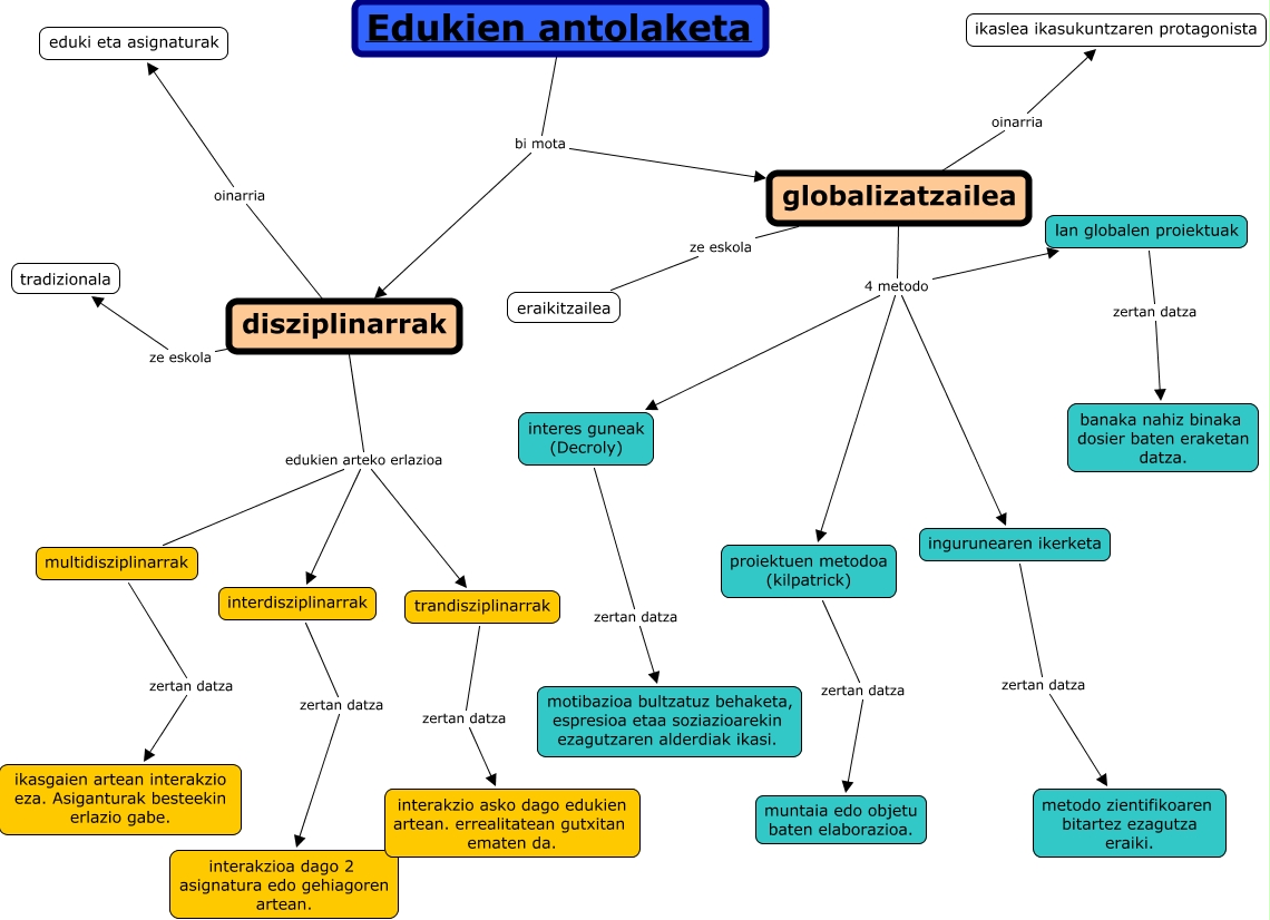 Este Cmap, tiene información relacionada con: T3.6. Edukien antolaketa (Iban Garai, Josu Iribar, Andoni Amutxastegi), disziplinarrak edukien arteko erlazioa trandisziplinarrak, disziplinarrak ze eskola tradizionala, trandisziplinarrak zertan datza interakzio asko dago edukien artean. errealitatean gutxitan ematen da., ingurunearen ikerketa zertan datza metodo zientifikoaren bitartez ezagutza eraiki., proiektuen metodoa (kilpatrick) zertan datza muntaia edo objetu baten elaborazioa., globalizatzailea 4 metodo interes guneak (Decroly), globalizatzailea 4 metodo lan globalen proiektuak, globalizatzailea 4 metodo proiektuen metodoa (kilpatrick), interes guneak (Decroly) zertan datza motibazioa bultzatuz behaketa, espresioa etaa soziazioarekin ezagutzaren alderdiak ikasi., disziplinarrak oinarria eduki eta asignaturak, globalizatzailea oinarria ikaslea ikasukuntzaren protagonista, Edukien antolaketa bi mota globalizatzailea, disziplinarrak edukien arteko erlazioa multidisziplinarrak, disziplinarrak edukien arteko erlazioa interdisziplinarrak, interdisziplinarrak zertan datza interakzioa dago 2 asignatura edo gehiagoren artean., globalizatzailea ze eskola eraikitzailea, lan globalen proiektuak zertan datza banaka nahiz binaka dosier baten eraketan datza., Edukien antolaketa bi mota disziplinarrak, multidisziplinarrak zertan datza ikasgaien artean interakzio eza. Asiganturak besteekin erlazio gabe., globalizatzailea 4 metodo ingurunearen ikerketa