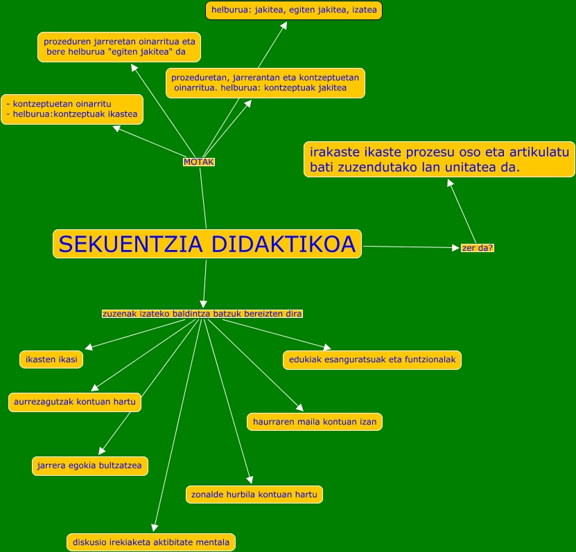 This Concept Map has information related to: t.3.7(sekuentzia didaktikoa), SEKUENTZIA DIDAKTIKOA MOTAK helburua: jakitea, egiten jakitea, izatea, SEKUENTZIA DIDAKTIKOA zer da? irakaste ikaste prozesu oso eta artikulatu bati zuzendutako lan unitatea da., SEKUENTZIA DIDAKTIKOA zuzenak izateko baldintza batzuk bereizten dira jarrera egokia bultzatzea, SEKUENTZIA DIDAKTIKOA zuzenak izateko baldintza batzuk bereizten dira aurrezagutzak kontuan hartu, SEKUENTZIA DIDAKTIKOA MOTAK prozeduren jarreretan oinarritua eta bere helburua "egiten jakitea" da, SEKUENTZIA DIDAKTIKOA zuzenak izateko baldintza batzuk bereizten dira zonalde hurbila kontuan hartu, SEKUENTZIA DIDAKTIKOA zuzenak izateko baldintza batzuk bereizten dira diskusio irekiaketa aktibitate mentala, SEKUENTZIA DIDAKTIKOA MOTAK prozeduretan, jarrerantan eta kontzeptuetan oinarritua. helburua: kontzeptuak jakitea, SEKUENTZIA DIDAKTIKOA zuzenak izateko baldintza batzuk bereizten dira edukiak esanguratsuak eta funtzionalak, SEKUENTZIA DIDAKTIKOA zuzenak izateko baldintza batzuk bereizten dira haurraren maila kontuan izan