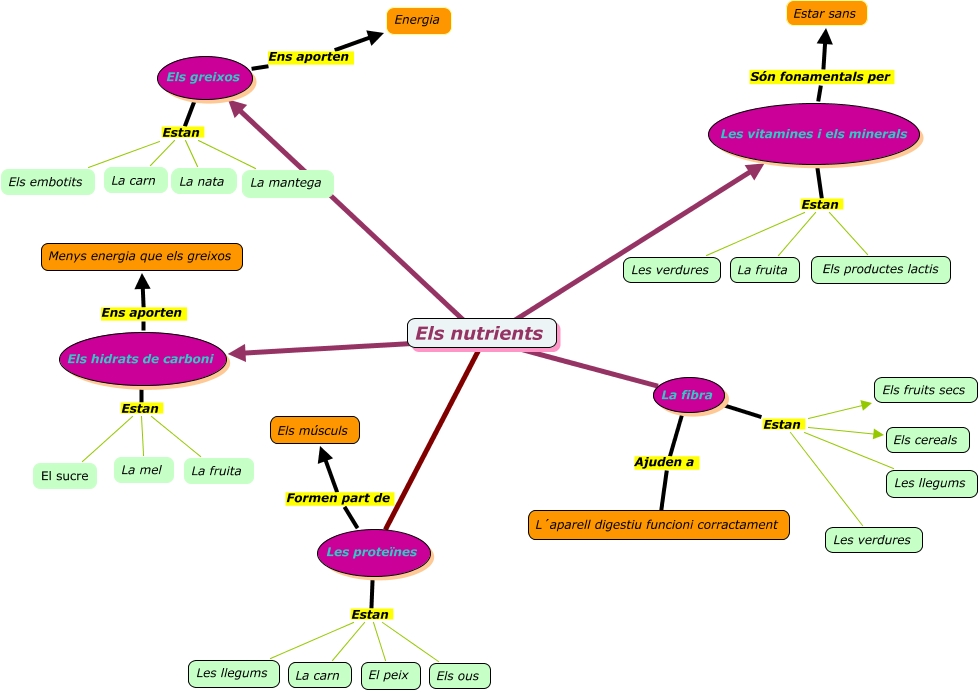 Aquest mapa conceptual conté informació relacionada amb: Els nutients inma, Les proteïnes Estan Les llegums, Els hidrats de carboni Estan El sucre, Els nutrients Tipus Les proteïnes, La fibra Estan Les verdures, Els hidrats de carboni Estan La fruita, Els greixos Estan La nata, Les vitamines i els minerals Estan Els productes lactis, Les proteïnes Estan Els ous, Els nutrients Tipus Els greixos, Les vitamines i els minerals Són fonamentals per Estar sans, Els hidrats de carboni Ens aporten Menys energia que els greixos, La fibra Estan Les llegums, Les proteïnes Estan La carn, Els nutrients Tipus Els hidrats de carboni, Els hidrats de carboni Estan La mel, Els greixos Estan Els embotits, La fibra Estan Els cereals, La fibra Estan Els fruits secs, Els greixos Estan La mantega, Els nutrients Tipus Les vitamines i els minerals