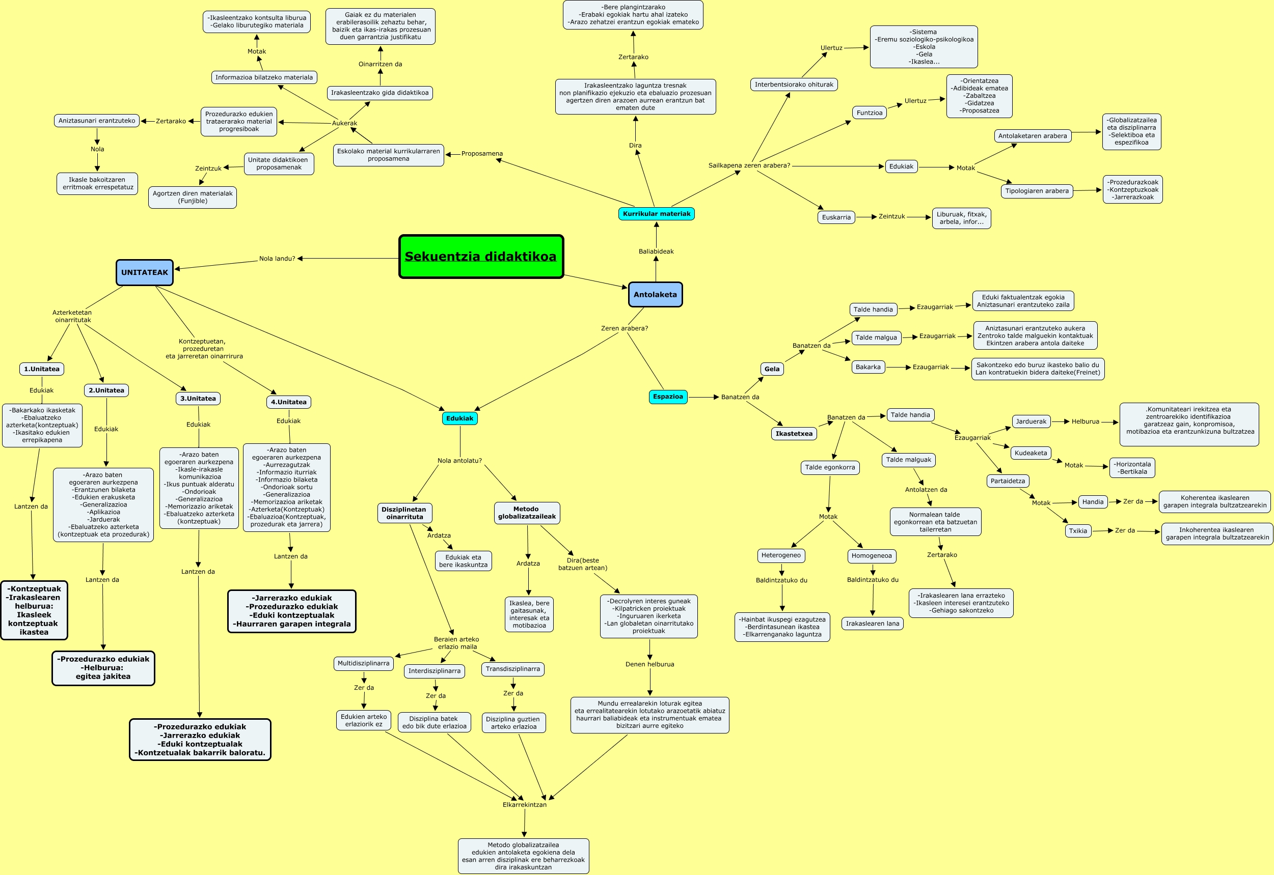 Este Cmap, tiene información relacionada con: Marta, Nekane, Mayi, Unitate didaktikoen proposamenak Zeintzuk Agortzen diren materialak (Funjible), Handia Zer da Koherentea ikaslearen garapen integrala bultzatzearekin, Edukiak Nola antolatu? Metodo globalizatzaileak, Eskolako material kurrikularraren proposamena Aukerak Informazioa bilatzeko materiala, Tipologiaren arabera ???? -Prozedurazkoak -Kontzeptuzkoak -Jarrerazkoak, Sekuentzia didaktikoa Nola landu? UNITATEAK, Antolaketa Zeren arabera? Edukiak, -Arazo baten egoeraren aurkezpena -Aurrezagutzak -Informazio iturriak -Informazio bilaketa -Ondorioak sortu -Generalizazioa -Memorizazioa ariketak -Azterketa(Kontzeptuak) -Ebaluazioa(Kontzeptuak, prozedurak eta jarrera) Lantzen da -Jarrerazko edukiak -Prozedurazko edukiak -Eduki kontzeptualak -Haurraren garapen integrala, Mundu errealarekin loturak egitea eta errealitatearekin lotutako arazoetatik abiatuz haurrari baliabideak eta instrumentuak ematea bizitzari aurre egiteko Elkarrekintzan Metodo globalizatzailea edukien antolaketa egokiena dela esan arren disziplinak ere beharrezkoak dira irakaskuntzan, Talde egonkorra Motak Homogeneoa, Euskarria Zeintzuk Liburuak, fitxak, arbela, infor..., Prozedurazko edukien trataerarako material progresiboak Zertarako Aniztasunari erantzuteko, Talde egonkorra Motak Heterogeneo, Talde handia Ezaugarriak Eduki faktualentzak egokia Aniztasunari erantzuteko zaila, Sekuentzia didaktikoa ???? Antolaketa, Eskolako material kurrikularraren proposamena Aukerak Prozedurazko edukien trataerarako material progresiboak, 3.Unitatea Edukiak -Arazo baten egoeraren aurkezpena -Ikasle-irakasle komunikazioa -Ikus puntuak alderatu -Ondorioak -Generalizazioa -Memorizazio ariketak -Ebaluatzeko azterketa (kontzeptuak), Informazioa bilatzeko materiala Motak -Ikasleentzako kontsulta liburua -Gelako liburutegiko materiala, Espazioa Banatzen da Ikastetxea, Kurrikular materiak Sailkapena zeren arabera? Funtzioa