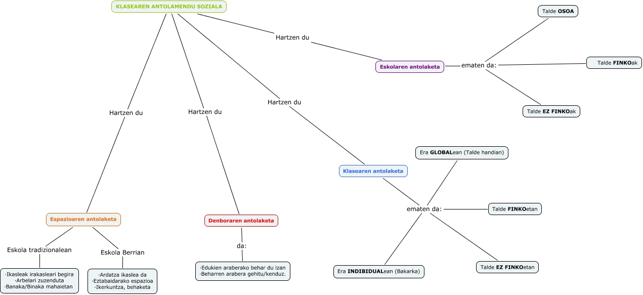 This Concept Map has information related to: K.A.(Amaia,MaitaneOlatz,Jessica,Marta), KLASEAREN ANTOLAMENDU SOZIALA Hartzen du Klasearen antolaketa, KLASEAREN ANTOLAMENDU SOZIALA Hartzen du Espazioaren antolaketa, Eskolaren antolaketa ematen da: Talde OSOA, Klasearen antolaketa ematen da: Era INDIBIDUALean (Bakarka), Espazioaren antolaketa Eskola tradizionalean ·Ikasleak irakasleari begira ·Arbelari zuzenduta ·Banaka/Binaka mahaietan, Klasearen antolaketa ematen da: Talde FINKOetan, Denboraren antolaketa da: ·Edukien araberako behar du izan ·Beharren arabera gehitu/kenduz., Klasearen antolaketa ematen da: Talde EZ FINKOetan, KLASEAREN ANTOLAMENDU SOZIALA Hartzen du Denboraren antolaketa, Eskolaren antolaketa ematen da: Talde EZ FINKOak