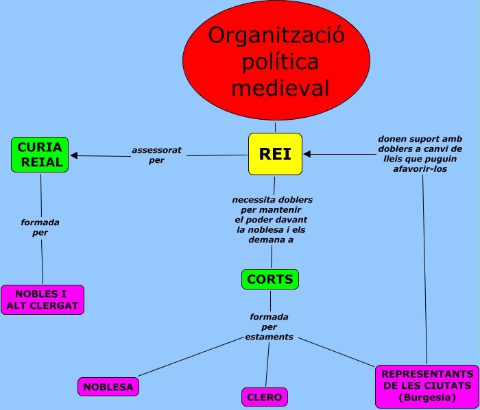 Aquest mapa conceptual conté informació relacionada amb: Estructura política medieval, CORTS formada per estaments REPRESENTANTS DE LES CIUTATS (Burgesia), REI necessita doblers per mantenir el poder davant la noblesa i els demana a CORTS, Organització política medieval REI, CORTS formada per estaments CLERO, REPRESENTANTS DE LES CIUTATS (Burgesia) donen suport amb doblers a canvi de lleis que puguin afavorir-los REI, CORTS formada per estaments NOBLESA, REI assessorat per CURIA REIAL, CURIA REIAL formada per NOBLES I ALT CLERGAT