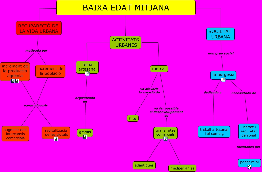 Aquest mapa conceptual conté informació relacionada amb: Presentació de La Baixa Edat Mitjana, ACTIVITATS URBANES feina artesanal, BAIXA EDAT MITJANA RECUPARECIÓ DE LA VIDA URBANA, SOCIETAT URBANA nou grup social la burgesia, feina artesanal organitzada en gremis, BAIXA EDAT MITJANA SOCIETAT URBANA, ACTIVITATS URBANES mercat, revitalització de les ciutats varen afavorir increment de la producció agrícola, grans rutes comercials atlàntiques, BAIXA EDAT MITJANA ACTIVITATS URBANES, RECUPARECIÓ DE LA VIDA URBANA motivada per increment de la població, increment de la població varen afavorir increment de la producció agrícola, RECUPARECIÓ DE LA VIDA URBANA motivada per increment de la producció agrícola, llibertat i seguretat personal necessitada de la burgesia, mercat va fer possible el desenvolupament de grans rutes comercials, llibertat i seguretat personal facilitades pel poder reial, increment de la població varen afavorir augment dels intercanvis comercials, mediterrànies grans rutes comercials, revitalització de les ciutats varen afavorir augment dels intercanvis comercials, la burgesia dedicada a treball artesanal i al comerç, mercat va afavorir la creació de fires