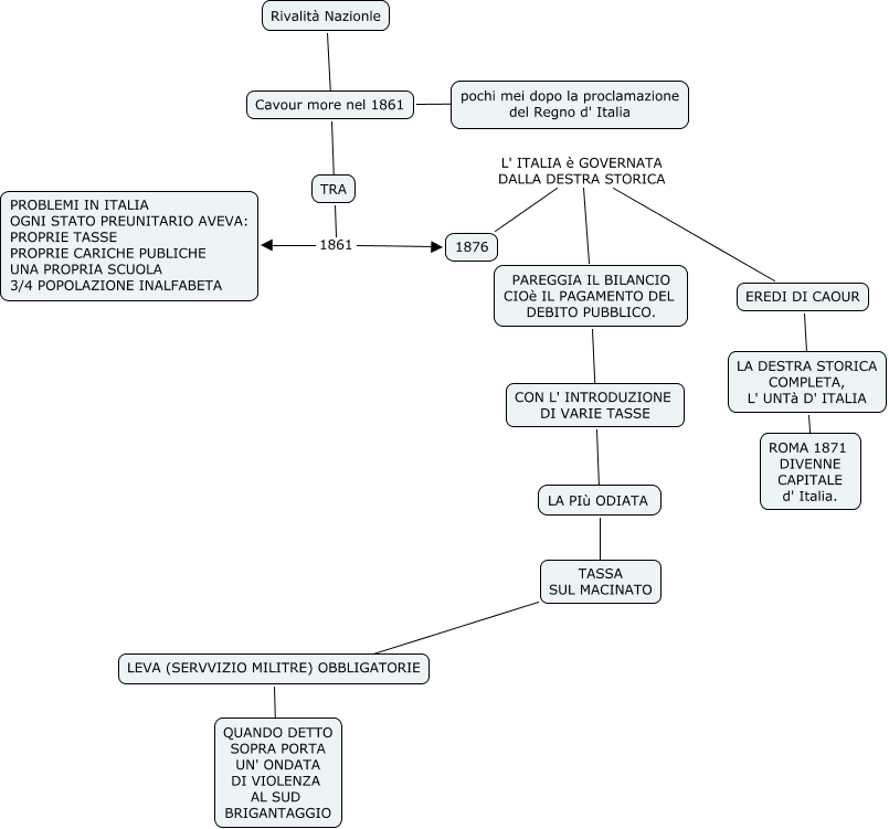 Questa Mappa Concettuale ha informazioni correlate a: la morte di Cavour, EREDI DI CAOUR ???? LA DESTRA STORICA COMPLETA, L' UNTà D' ITALIA, 1876 L' ITALIA è GOVERNATA DALLA DESTRA STORICA PAREGGIA IL BILANCIO CIOè IL PAGAMENTO DEL DEBITO PUBBLICO., LA DESTRA STORICA COMPLETA, L' UNTà D' ITALIA ???? ROMA 1871 DIVENNE CAPITALE d' Italia., EREDI DI CAOUR ???? LA DESTRA STORICA COMPLETA, L' UNTà D' ITALIA, CON L' INTRODUZIONE DI VARIE TASSE ???? LA PIù ODIATA, Cavour more nel 1861 ???? TRA, Cavour more nel 1861 ???? pochi mei dopo la proclamazione del Regno d' Italia, 1876 L' ITALIA è GOVERNATA DALLA DESTRA STORICA EREDI DI CAOUR, TRA 1861 PROBLEMI IN ITALIA OGNI STATO PREUNITARIO AVEVA: PROPRIE TASSE PROPRIE CARICHE PUBLICHE UNA PROPRIA SCUOLA 3/4 POPOLAZIONE INALFABETA, LA PIù ODIATA ???? TASSA SUL MACINATO