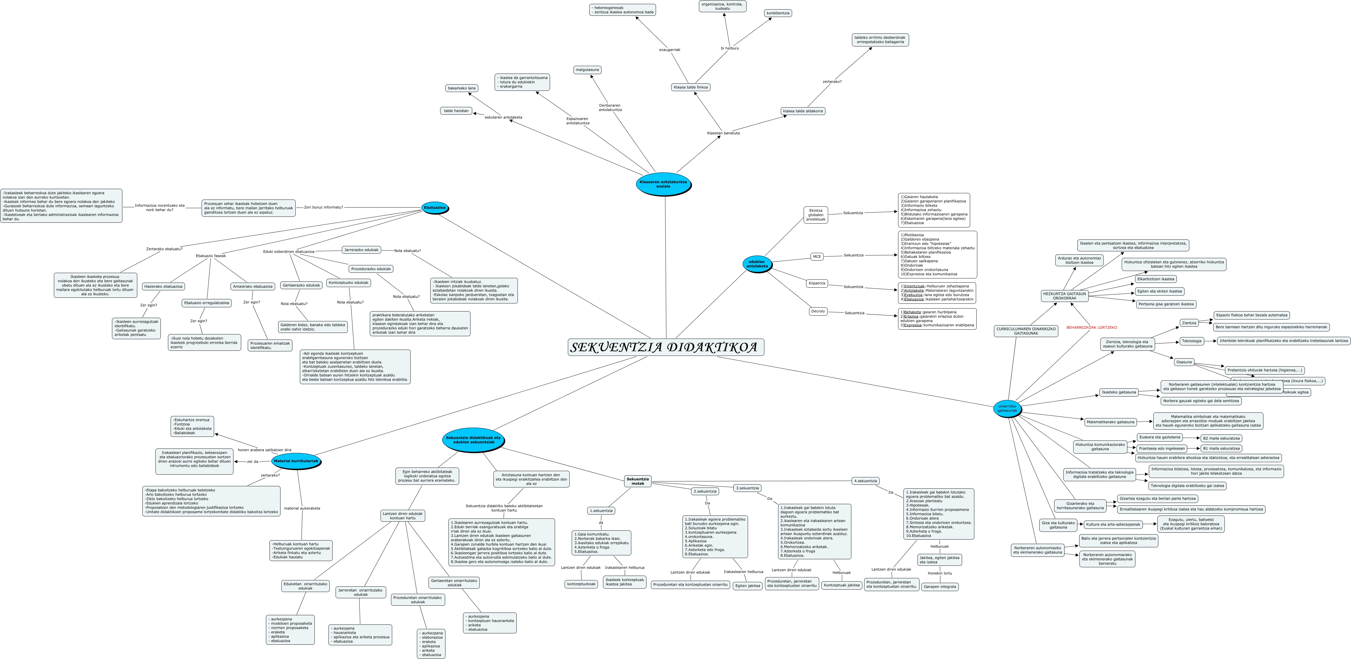 This Concept Map has information related to: sekuentzia didaktikoaren osagai guztiak (alfonso, axier, egoitz,arkaitz,aritz), Kilpatrick Sekuentzia 1)Intentzioak:Helburuen zehaztapena 2)Antolaketa:Materialaren laguntzarekin 3)Exekuzioa:lana egitea edo burutzea 4)Ebaluazioa:ikasleen partehartzearekin, Klasea talde finkoa bi helburu konbibentzia, Gertaeretan oinarritutako edukiak ???? - aurkezpena - kontzeptuen hausnarketa - ariketa - ebaluazioa, Klasea talde finkoa bi helburu organizazioa, kontrola, kudeatu, edukien antolaketa ???? MCE, Klasearen antolakuntza soziala Klasetan banatuta klasea talde aldakorra, Ebaluazioa Eduki ezberdinen ebaluazioa Jarrerazko edukiak, Ikasteko gaitasuna ???? Norberaren gaitasunen (intelektualak) kontzientzia hartzea eta gaitasun honek garatzeko prozesuaz eta estrategiaz jabetzea, Ebaluazioa Zertarako ebaluatu? Ikasleen ikasketa prozesua nolakoa den ikusteko eta bere gaitasunak obetu dituen ala ez ikusteko eta bere mailara egokitutako helburuak lortu dituen ala ez ikusteko., Osasuna ???? Jolastea eta kirola eta ariketa fisikoak egitea