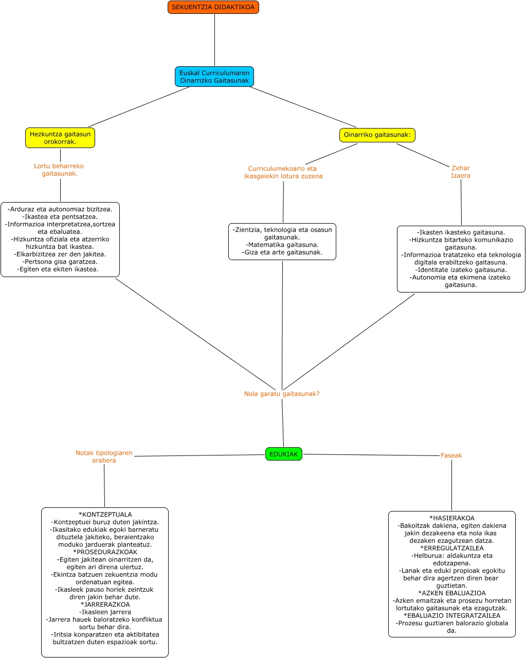 Este Cmap, tiene información relacionada con: Euskal curriculumaren oinarrizko gaitasuna iñaki, xuban eta aitor, Oinarriko gaitasunak: Curriculumekoarlo eta ikasgaiekin lotura zuzena -Zientzia, teknologia eta osasun gaitasunak. -Matematika gaitasuna. -Giza eta arte gaitasunak., Euskal Curriculumaren Oinarrizko Gaitasunak ???? Oinarriko gaitasunak:, -Zientzia, teknologia eta osasun gaitasunak. -Matematika gaitasuna. -Giza eta arte gaitasunak. Nola garatu gaitasunak? EDUKIAK, SEKUENTZIA DIDAKTIKOA ???? Euskal Curriculumaren Oinarrizko Gaitasunak, Euskal Curriculumaren Oinarrizko Gaitasunak ???? Hezkuntza gaitasun orokorrak., EDUKIAK Faseak *HASIERAKOA -Bakoitzak dakiena, egiten dakiena jakin dezakeena eta nola ikas dezaken ezagutzean datza. *ERREGULATZAILEA -Helburua: aldakuntza eta edotzapena. -Lanak eta eduki propioak egokitu behar dira agertzen diren bear guztietan. *AZKEN EBALUAZIOA -Azken emaitzak eta prosezu horretan lortutako gaitasunak eta ezagutzak. *EBALUAZIO INTEGRATZAILEA -Prozesu guztiaren balorazio globala da., -Ikasten ikasteko gaitasuna. -Hizkuntza bitarteko komunikazio gaitasuna. -Informazioa tratatzeko eta teknologia digitala erabiltzeko gaitasuna. -Identitate izateko gaitasuna. -Autonomia eta ekimena izateko gaitasuna. Nola garatu gaitasunak? EDUKIAK, Oinarriko gaitasunak: Zehar Izaera -Ikasten ikasteko gaitasuna. -Hizkuntza bitarteko komunikazio gaitasuna. -Informazioa tratatzeko eta teknologia digitala erabiltzeko gaitasuna. -Identitate izateko gaitasuna. -Autonomia eta ekimena izateko gaitasuna., Hezkuntza gaitasun orokorrak. Lortu beharreko gaitasunak. -Arduraz eta autonomiaz bizitzea. -Ikastea eta pentsatzea. -Informazioa interpretatzea,sortzea eta ebaluatea. -Hizkuntza ofiziala eta atzerriko hizkuntza bat ikastea. -Elkarbizitzea zer den jakitea. -Pertsona gisa garatzea. -Egiten eta ekiten ikastea., EDUKIAK Notak tipologiaren arabera *KONTZEPTUALA -Kontzeptuei buruz duten jakintza. -Ikasitako edukiak egoki barneratu dituztela jakiteko, beraientzako moduko jarduerak planteatuz. *PROSEDURAZKOAK -Egiten jakitean oinarritzen da, egiten ari direna ulertuz. -Ekintza batzuen zekuentzia modu ordenatuan egitea. -Ikasleek pauso horiek zeintzuk diren jakin behar dute. *JARRERAZKOA -Ikasleen jarrera -Jarrera hauek baloratzeko konfliktua sortu behar dira. -Iritsia konparatzen eta aktibitatea bultzatzen duten espazioak sortu., -Arduraz eta autonomiaz bizitzea. -Ikastea eta pentsatzea. -Informazioa interpretatzea,sortzea eta ebaluatea. -Hizkuntza ofiziala eta atzerriko hizkuntza bat ikastea. -Elkarbizitzea zer den jakitea. -Pertsona gisa garatzea. -Egiten eta ekiten ikastea. Nola garatu gaitasunak? EDUKIAK