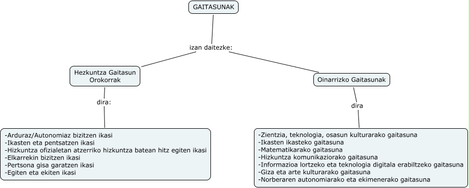 Este Cmap, tiene información relacionada con: gaitasunak (jessi,maitane,marta,amaia), GAITASUNAK izan daitezke: Oinarrizko Gaitasunak, Hezkuntza Gaitasun Orokorrak dira: -Arduraz/Autonomiaz bizitzen ikasi -Ikasten eta pentsatzen ikasi -Hizkuntza ofizialetan atzerriko hizkuntza batean hitz egiten ikasi -Elkarrekin bizitzen ikasi -Pertsona gisa garatzen ikasi -Egiten eta ekiten ikasi, Oinarrizko Gaitasunak dira -Zientzia, teknologia, osasun kulturarako gaitasuna -Ikasten ikasteko gaitasuna -Matematikarako gaitasuna -Hizkuntza komunikaziorako gaitasuna -Informazioa lortzeko eta teknologia digitala erabiltzeko gaitasuna -Giza eta arte kulturarako gaitasuna -Norberaren autonomiarako eta ekimenerako gaitasuna, GAITASUNAK izan daitezke: Hezkuntza Gaitasun Orokorrak