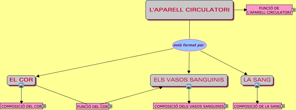 Este Cmap, tiene información relacionada con: 2.1.MAPA CONCEPTUAL DE L'APARELL CIRCULATORI, FER CIRCULAR LA SANG gràcies als BATECS, ELS VASOS SANGUINIS estan formats per VENES, BATECS dues fases SÍSTOLE, AURÍCULES n'hi ha dues AURÍCULA ESQUERRA, PLAQUETES s'encarreguen de COAGULAR FERIDES, ELS VASOS SANGUINIS estan formats per CAPIL.LARS, VENTRÍCLES n'hi ha dos VENTRICLE DRET, INTERCANVI DE SUBSTÀNCIES com OXÍGEN, CAPIL.LARS connecten ARTÈRIES, INTERCANVI DE SUBSTÀNCIES en els ÒRGANS, VENTRICLE DRET estan connectats per VÀLVULA TRICÚSPIDE, EL COR funció FER CIRCULAR LA SANG, CÈL.LULES tres tipus PLAQUETES, EL COR està format per VENTRÍCLES, AURÍCULA DRETA estan connectats per VÀLVULA TRICÚSPIDE, L'APARELL CIRCULATORI està format per EL COR, ARTÈRIES transporten LA SANG, EL COR està format per AURÍCULES, GLOBULS VERMELLS arrepleguen DIÒXID DE CARBONI, VENTRICLE ESQUERRE estan connectats per VÀLVULA MITRAL