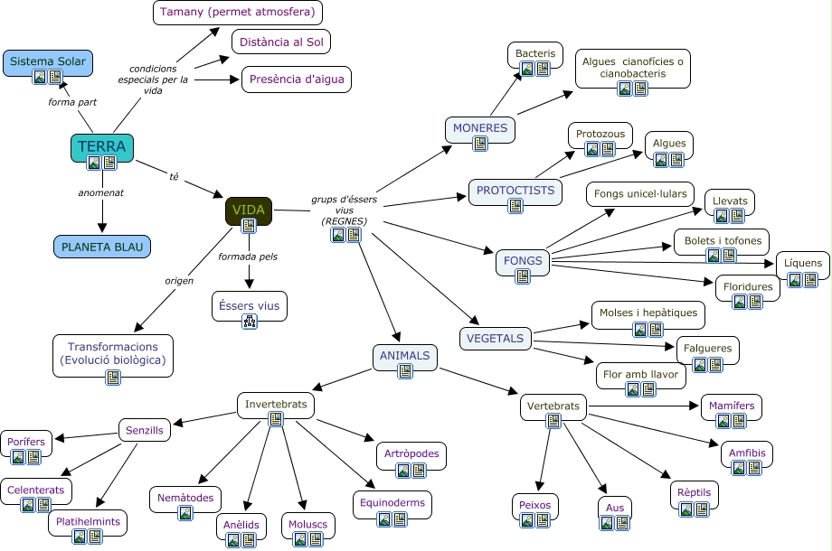 Este Cmap, tiene información relacionada con: Terra, Senzills Celenterats, FONGS Fongs unicel·lulars, VIDA origen Transformacions (Evolució biològica), FONGS Llevats, VEGETALS Flor amb llavor, Senzills Platihelmints, FONGS Líquens, Invertebrats Artròpodes, Invertebrats Moluscs, VIDA grups d'éssers vius (REGNES) VEGETALS, ANIMALS Vertebrats, MONERES Bacteris, TERRA forma part Sistema Solar, FONGS Floridures, ANIMALS Invertebrats, VIDA grups d'éssers vius (REGNES) MONERES, TERRA anomenat PLANETA BLAU, PROTOCTISTS Algues, TERRA condicions especials per la vida Tamany (permet atmosfera), Senzills Porífers