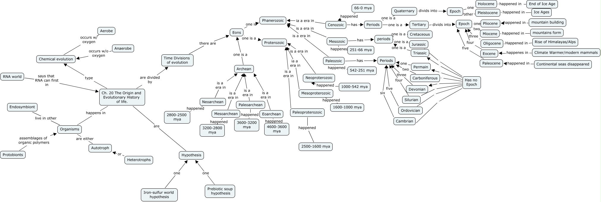 This Concept Map has information related to: Ch. 20 Dean Freundlich, Mesozoic has periods, Has no Epoch Cambrian, Paleoproterozoic happened 2500-1600 mya, Mesozoic is a era in Phanerozoic, Cretaceous one is a periods, Time Divisions of evolution there are Eons, Eoarchean is a era in Archean, End of Ice Age happened in Holocene, Ordovician five Periods, Oligocene three Epoch
