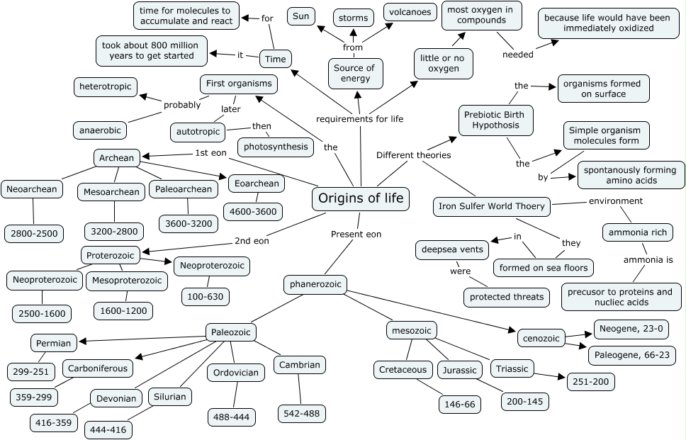 This Concept Map has information related to: CHP 20 Ben Saari, Paleozoic ???? Permian, Paleozoic ???? Devonian, formed on sea floors in deepsea vents, Origins of life 1st eon Archean, Ordovician ???? 488-444, Paleozoic ???? Ordovician, Permian ???? 299-251, First organisms probably heterotropic, Prebiotic Birth Hypothosis the organisms formed on surface, Origins of life requirements for life Source of energy
