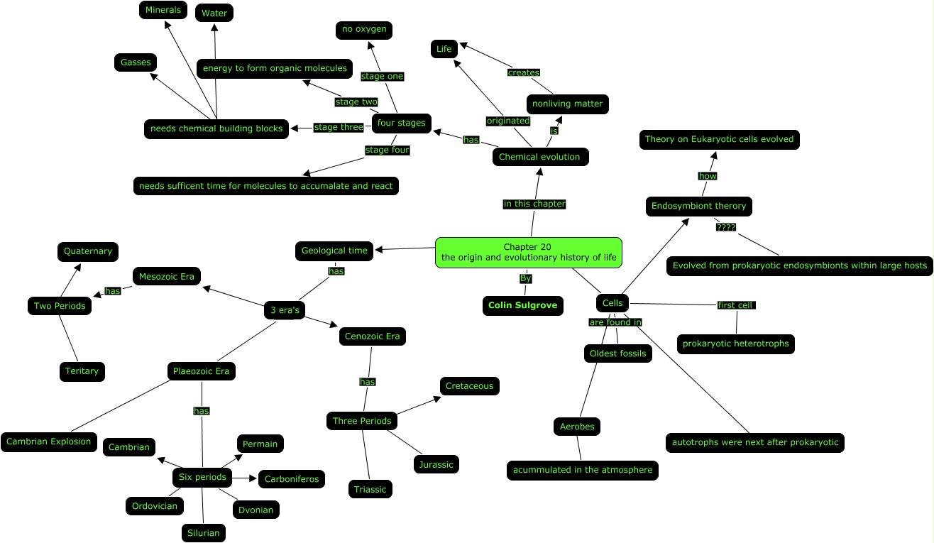 This Concept Map has information related to: Chapter 20, nonliving matter creates Life, 3 era's ???? Plaeozoic Era, Six periods ???? Ordovician, Chapter 20 the origin and evolutionary history of life in this chapter Chemical evolution, Six periods ???? Cambrian, Three Periods ???? Triassic, Cells ???? Aerobes, Mesozoic Era has Two Periods, Cells are found in Oldest fossils, needs chemical building blocks ???? Gasses