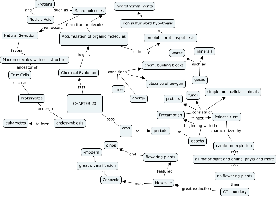 This Concept Map has information related to: Lucy V. Chapter 20, Accumulation of organic molecules either by prebiotic broth hypothesis, periods to epochs, cambrian explosion ???? all major plant and animal phyla and more, Chemical Evolution conditions energy, Chemical Evolution begins Accumulation of organic molecules, iron sulfur word hypothesis in hydrothermal vents, chem. buiding blocks such as water, True Cells such as Prokaryotes, Accumulation of organic molecules form from molecules Macromolecules, Mesozoic next Cenozoic