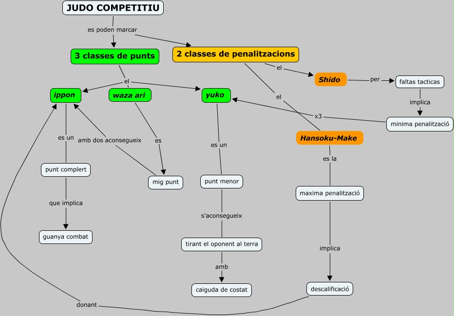 Este Cmap, tiene información relacionada con: JUDO COMPETITIU, Shido per faltas tacticas, 2 classes de penalitzacions el Hansoku-Make, maxima penalització implica descalificació, 3 classes de punts el ippon, waza ari es mig punt, 3 classes de punts el yuko, mig punt amb dos aconsegueix ippon, JUDO COMPETITIU es poden marcar 2 classes de penalitzacions, Hansoku-Make es la maxima penalització, JUDO COMPETITIU es poden marcar 3 classes de punts, punt menor s'aconsegueix tirant el oponent al terra, yuko es un punt menor, faltas tacticas implica minima penalització, descalificació donant ippon, punt complert que implica guanya combat, ippon es un punt complert, 3 classes de punts el waza ari, 2 classes de penalitzacions el Shido, minima penalització x3 yuko, tirant el oponent al terra amb caiguda de costat