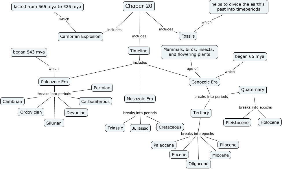 This Concept Map has information related to: Chapter 20 - Kelsey E, Cambrian Explosion which lasted from 565 mya to 525 mya, Paleozoic Era which began 543 mya, Cenozoic Era age of Mammals, birds, insects, and flowering plants, Chaper 20 includes Fossils, Mesozoic Era breaks into periods Jurassic, Paleozoic Era breaks into periods Carboniferous, Quaternary breaks into epochs Holocene, Paleozoic Era breaks into periods Ordovician, Paleozoic Era breaks into periods Cambrian, Chaper 20 includes Timeline