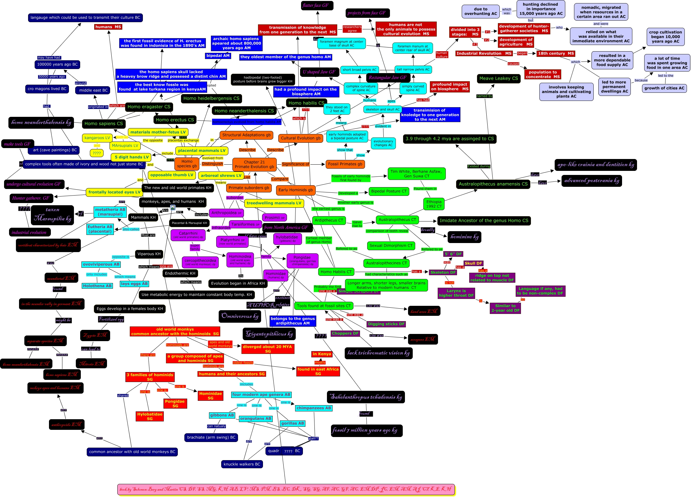 This Concept Map has information related to: Untitled, simply curved spine AC ???? tall narrow pelvis AC, evolutionary changes AC ???? early hominids adopted a bipedal posture AC, Primate suborders gb suborder Prosimii DP, 5 digit hands LV and opposable thumb LV, Homo species gb ???? Homo neanderthalensis CS, monkeys, apes, and humans KH Are Mammals KH, found in east Africa SG mostly in Kenya, Anthropoidea DP branched into The new and old world primates KH, Chapter 21 Primate Evolution gb Describe Structural Adaptations gb, Early Hominids gb Fossils of early hominids first found by Tim White, Berhane Asfaw, Gen Suwa CT