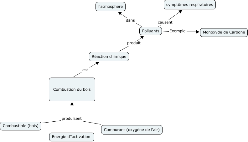Cette carte conceptuelle, cree avec IHMC CmapTools, contient des informations liees a : S6 Effets de la combustion du bois, Polluants causent symptômes respiratoires, Combustion du bois est Réaction chimique, Polluants Exemple Monoxyde de Carbone, Comburant (oxygène de l'air) produisent Combustion du bois, Polluants dans l'atmosphère, Réaction chimique produit Polluants, Combustible (bois) produisent Combustion du bois, Energie d''activation produisent Combustion du bois