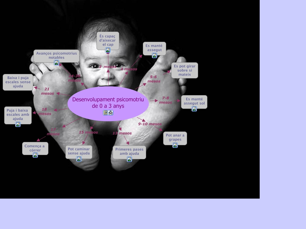 Este Cmap, tiene información relacionada con: Desenvolupament (activitat 3), Desenvolupament psicomotriu de 0 a 3 anys 3 mesos És capaç d'aixecar el cap, Desenvolupament psicomotriu de 0 a 3 anys 21 mesos Baixa i puja escales sense ajuda, Desenvolupament psicomotriu de 0 a 3 anys 13 mesos Primeres pases amb ajuda, Desenvolupament psicomotriu de 0 a 3 anys 24-36 mesos Avanços psicomotrius notables, Desenvolupament psicomotriu de 0 a 3 anys 5-6 mesos Es pot girar sobre si mateix, Desenvolupament psicomotriu de 0 a 3 anys 15 mesos Pot caminar sense ajuda, Desenvolupament psicomotriu de 0 a 3 anys 9-10 mesos Pot anar a grapes, Desenvolupament psicomotriu de 0 a 3 anys 4 mesos Es manté assegut, Desenvolupament psicomotriu de 0 a 3 anys 17 mesos Comença a córrer, Desenvolupament psicomotriu de 0 a 3 anys 18 mesos Puja i baixa escales amb ajuda, Desenvolupament psicomotriu de 0 a 3 anys 7-8 mesos Es manté assegut sol