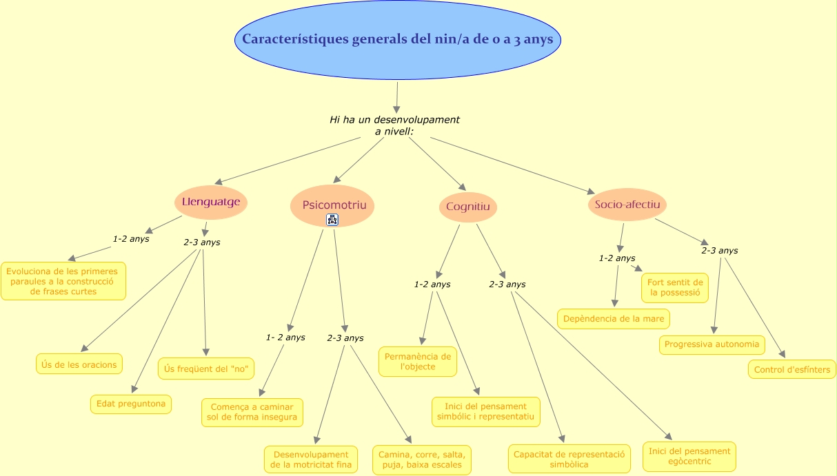 Este Cmap, tiene información relacionada con: Característiques (activitat 1 i 2), Cognitiu 2-3 anys Capacitat de representació simbòlica, Característiques generals del nin/a de 0 a 3 anys Hi ha un desenvolupament a nivell: Cognitiu, Psicomotriu 1- 2 anys Comença a caminar sol de forma insegura, Característiques generals del nin/a de 0 a 3 anys Hi ha un desenvolupament a nivell: Psicomotriu, Psicomotriu 2-3 anys Desenvolupament de la motricitat fina, Característiques generals del nin/a de 0 a 3 anys Hi ha un desenvolupament a nivell: Llenguatge, Socio-afectiu 1-2 anys Fort sentit de la possessió, Llenguatge 2-3 anys Ús freqüent del "no", Cognitiu 1-2 anys Permanència de l'objecte, Psicomotriu 2-3 anys Camina, corre, salta, puja, baixa escales, Socio-afectiu 2-3 anys Progressiva autonomia, Característiques generals del nin/a de 0 a 3 anys Hi ha un desenvolupament a nivell: Socio-afectiu, Cognitiu 2-3 anys Inici del pensament egòcentric, Socio-afectiu 2-3 anys Control d'esfínters, Llenguatge 2-3 anys Edat preguntona, Cognitiu 1-2 anys Inici del pensament simbólic i representatiu, Llenguatge 1-2 anys Evoluciona de les primeres paraules a la construcció de frases curtes, Socio-afectiu 1-2 anys Depèndencia de la mare, Llenguatge 2-3 anys Ús de les oracions