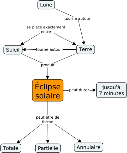 Cette carte de concepts créée avec IHMC CmapTools traite de: S7-Éclipse solaire, Lune se place exactement entre Terre, Terre tourne autour Soleil, Éclipse solaire peut durer jusqu'à 7 minutes, Lune se place exactement entre Soleil, Éclipse solaire peut être de forme Totale, Terre produit Éclipse solaire, Soleil produit Éclipse solaire, Lune tourne autour Terre, Éclipse solaire peut être de forme Partielle, Éclipse solaire peut être de forme Annulaire