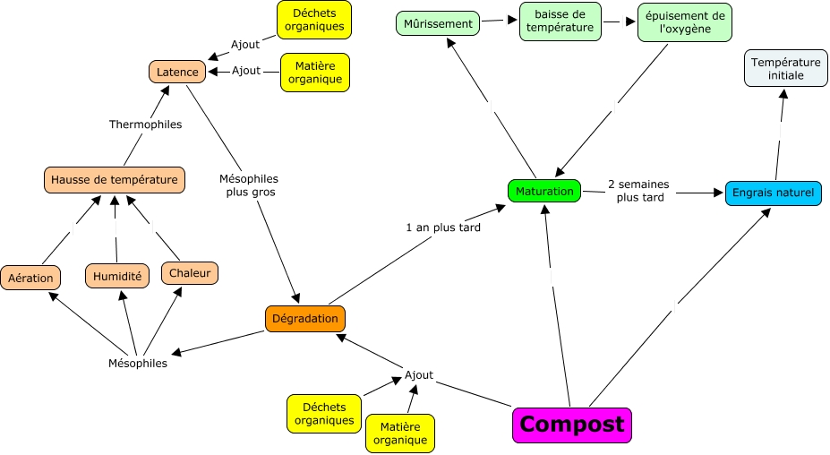 Cette carte conceptuelle, cree avec IHMC CmapTools, contient des informations liees a : S12 - Compost, Dégradation Mésophiles Chaleur, Dégradation Mésophiles Humidité, Déchets organiques Ajout Latence, Aération Hausse de température, Dégradation Mésophiles Aération, Dégradation 1 an plus tard Maturation, Engrais naturel Température initiale, Matière organique Ajout Dégradation, Compost Ajout Dégradation, Humidité Hausse de température, Matière organique Ajout Latence, Compost Engrais naturel, baisse de température épuisement de l'oxygène, Déchets organiques Ajout Dégradation, Chaleur Hausse de température, Compost Maturation, Maturation Mûrissement, Latence Mésophiles plus gros Dégradation, Mûrissement baisse de température, Maturation 2 semaines plus tard Engrais naturel