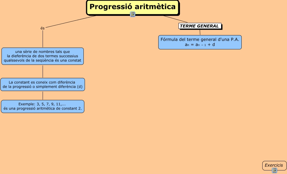 Este mapa conceptual tiene información relacionada a: Progressions aritmètiques, Progressió aritmètica TERME GENERAL, TERME GENERAL Fórmula del terme general d'una P.A. an = an − 1 + d, La constant es coneix com diferència de la progressió o simplement diferència (d) Exemple: 3, 5, 7, 9, 11,... és una progressió aritmètica de constant 2., Progressió aritmètica és una sèrie de nombres tals que la dieferència de dos termes successius qualssevols de la seqüència és una constat, una sèrie de nombres tals que la dieferència de dos termes successius qualssevols de la seqüència és una constat La constant es coneix com diferència de la progressió o simplement diferència (d)