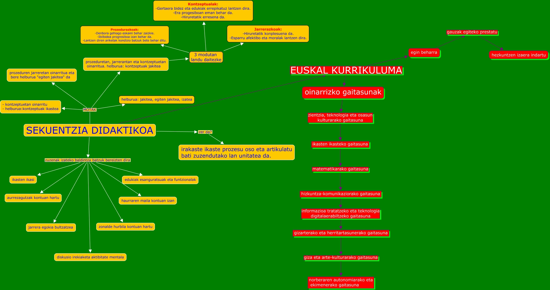 This Concept Map has information related to: t.3.7(sekuentzia didaktikoa berrie), SEKUENTZIA DIDAKTIKOA zuzenak izateko baldintza batzuk bereizten dira ikasten ikasi, SEKUENTZIA DIDAKTIKOA MOTAK prozeduretan, jarrerantan eta kontzeptuetan oinarritua. helburua: kontzeptuak jakitea, SEKUENTZIA DIDAKTIKOA zuzenak izateko baldintza batzuk bereizten dira edukiak esanguratsuak eta funtzionalak, SEKUENTZIA DIDAKTIKOA zuzenak izateko baldintza batzuk bereizten dira zonalde hurbila kontuan hartu, prozeduretan, jarrerantan eta kontzeptuetan oinarritua. helburua: kontzeptuak jakitea 3 modutan landu daitezke Jarrerazkoak: -Hiruretatik konplesuena da. -Esparru afektibo eta moralak lantzen dira., SEKUENTZIA DIDAKTIKOA EUSKAL KURRIKULUMA oinarrizko gaitasunak, hizkuntza-komunikaziorako gaitasuna informazioa tratatzeko eta teknologia digitalaerabiltzeko gaitasuna gizarterako eta herritartasunerako gaitasuna, SEKUENTZIA DIDAKTIKOA MOTAK - kontzeptuetan oinarritu - helburua:kontzeptuak ikastea, SEKUENTZIA DIDAKTIKOA zuzenak izateko baldintza batzuk bereizten dira diskusio irekiaketa aktibitate mentala, SEKUENTZIA DIDAKTIKOA MOTAK prozeduren jarreretan oinarritua eta bere helburua "egiten jakitea" da