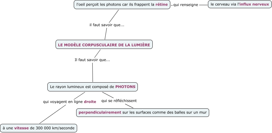 Cette carte conceptuelle, cree avec IHMC CmapTools, contient des informations liees a : S3_modèle corpusculaire de la lumière, l'oeil perçoit les photons car ils frappent la rétine qui renseigne le cerveau via l'influx nerveux, LE MODÈLE CORPUSCULAIRE DE LA LUMIÈRE Il faut savoir que... Le rayon lumineux est composé de PHOTONS, Le rayon lumineux est composé de PHOTONS qui voyagent en ligne droite à une vitesse de 300 000 km/seconde, Le rayon lumineux est composé de PHOTONS qui se réfléchissent perpendiculairement sur les surfaces comme des balles sur un mur, LE MODÈLE CORPUSCULAIRE DE LA LUMIÈRE il faut savoir que... l'oeil perçoit les photons car ils frappent la rétine