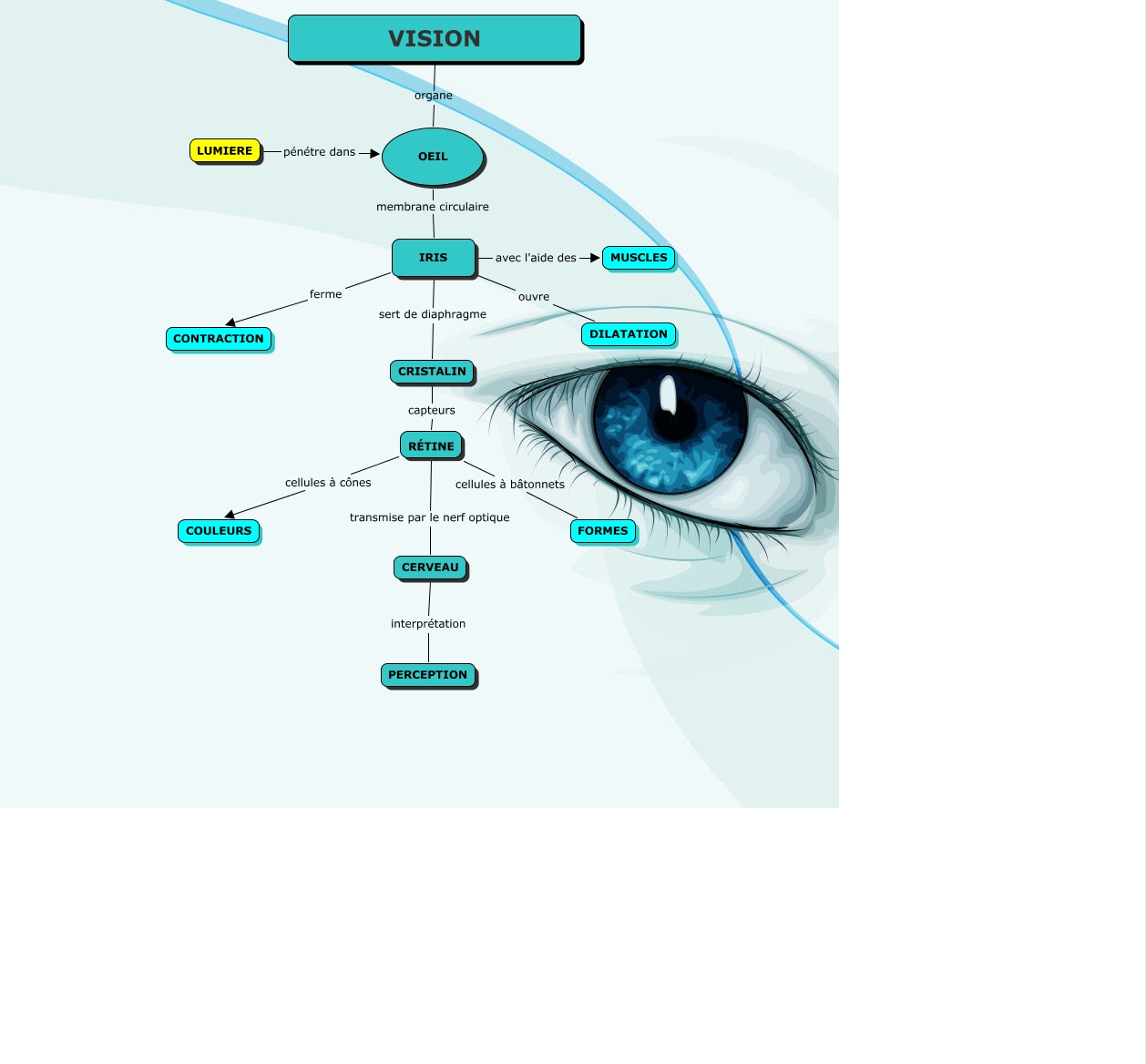 Cette carte conceptuelle, cree avec IHMC CmapTools, contient des informations liees a : L'oeil humain, RÉTINE transmise par le nerf optique CERVEAU, CRISTALIN capteurs RÉTINE, IRIS sert de diaphragme CRISTALIN, OEIL membrane circulaire IRIS, RÉTINE cellules à bâtonnets FORMES, RÉTINE cellules à cônes COULEURS, VISION organe OEIL, IRIS avec l'aide des MUSCLES, IRIS ouvre DILATATION, LUMIERE pénétre dans OEIL, CERVEAU interprétation PERCEPTION, IRIS ferme CONTRACTION