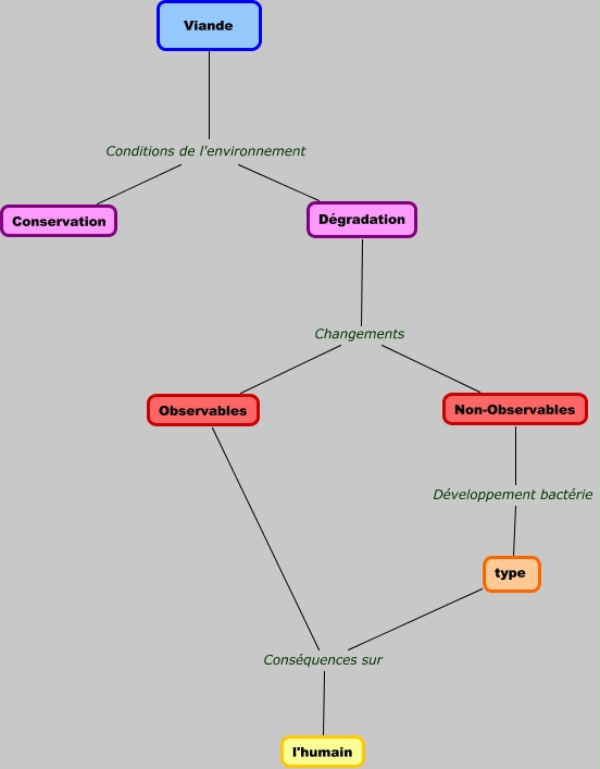 Cette carte conceptuelle, cree avec IHMC CmapTools, contient des informations liees a : S8, Dégradation Changements Non-Observables, Observables Conséquences sur l'humain, Viande Conditions de l'environnement Dégradation, Dégradation Changements Observables, Viande Conditions de l'environnement Conservation, type Conséquences sur l'humain, Non-Observables Développement bactérie type