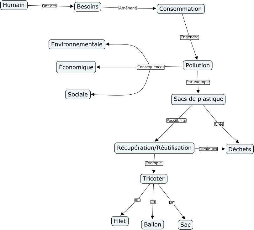 Cette carte conceptuelle, cree avec IHMC CmapTools, contient des informations liees a : S10 - Tricot de sacs de plastique, Consommation Engendre Pollution, Tricoter un Ballon, Besoins Amènent Consommation, Pollution Conséquences Économique, Pollution Conséquences Environnementale, Pollution Par exemple Sacs de plastique, Sacs de plastique Possiibilité Récupération/Réutilisation, Récupération/Réutilisation Diminues Déchets, Tricoter un Sac, Récupération/Réutilisation Exemple Tricoter, Humain Ont des Besoins, Sacs de plastique Crée Déchets, Tricoter un Filet, Pollution Conséquences Sociale