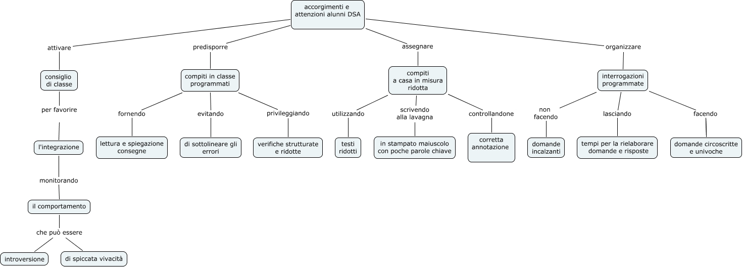 Questa Mappa Concettuale ha informazioni correlate a: Gruppo4proposta, compiti a casa in misura ridotta utilizzando testi ridotti, compiti in classe programmati privileggiando verifiche strutturate e ridotte, accorgimenti e attenzioni alunni DSA attivare consiglio di classe, il comportamento che può essere di spiccata vivacità, accorgimenti e attenzioni alunni DSA assegnare compiti a casa in misura ridotta, l'integrazione monitorando il comportamento, compiti a casa in misura ridotta scrivendo alla lavagna in stampato maiuscolo con poche parole chiave, compiti in classe programmati fornendo lettura e spiegazione consegne, interrogazioni programmate lasciando tempi per la rielaborare domande e risposte, accorgimenti e attenzioni alunni DSA predisporre compiti in classe programmati, il comportamento che può essere introversione, compiti a casa in misura ridotta controllandone corretta annotazione, consiglio di classe per favorire l'integrazione, compiti in classe programmati evitando di sottolineare gli errori, interrogazioni programmate facendo domande circoscritte e univoche, accorgimenti e attenzioni alunni DSA organizzare interrogazioni programmate, interrogazioni programmate non facendo domande incalzanti, interrogazioni programmate facendo domande circoscritte e univoche
