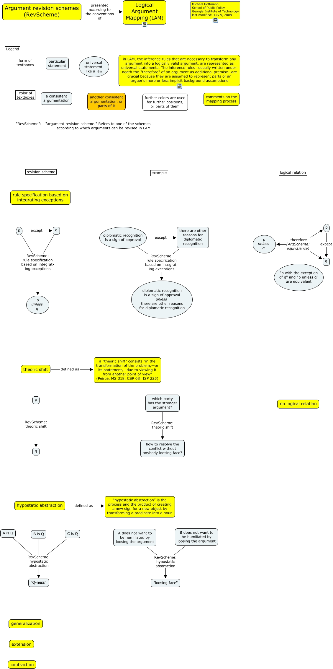 This Concept Map, created with IHMC CmapTools, has information related to: argument revision schemes, "p with the exception of q" and "p unless q" are equivalent therefore (ArgScheme: equivalence) p, diplomatic recognition is a sign of approval except there are other reasons for diplomatic recognition, hypostatic abstraction defined as “hypostatic abstraction” is the process and the product of creating a new sign for a new object by transforming a predicate into a noun, B does not want to be humiliated by loosing the argument RevScheme: hypostatic abstraction "loosing face", A is Q RevScheme: hypostatic abstraction "Q-ness", p RevScheme: rule specification based on integrat- ing exceptions p unless q, q RevScheme: rule specification based on integrat- ing exceptions p unless q, which party has the stronger argument? RevScheme: theoric shift how to resolve the conflict without anybody loosing face?, C is Q RevScheme: hypostatic abstraction "Q-ness", diplomatic recognition is a sign of approval RevScheme: rule specification based on integrat- ing exceptions diplomatic recognition is a sign of approval unless there are other reasons for diplomatic recognition, theoric shift defined as a "theoric shift" consists “in the transformation of the problem,—or its statement,—due to viewing it from another point of view” (Peirce, MS 318, CSP 68=ISP 225), "p with the exception of q" and "p unless q" are equivalent therefore (ArgScheme: equivalence) p unless q, Argument revision schemes (RevScheme) presented according to the conventions of Logical Argument Mapping (LAM), p RevScheme: theoric shift q, A does not want to be humiliated by loosing the argument RevScheme: hypostatic abstraction "loosing face", "p with the exception of q" and "p unless q" are equivalent therefore (ArgScheme: equivalence) q, p except q, p except q, there are other reasons for diplomatic recognition RevScheme: rule specification based on integrat- ing exceptions diplomatic recognition is a sign of approval unless there are other reasons for diplomatic recognition, B is Q RevScheme: hypostatic abstraction "Q-ness"