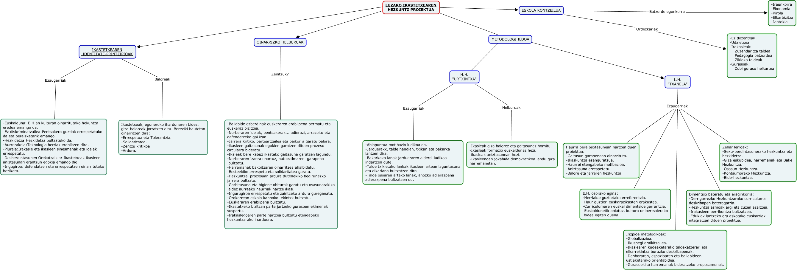 Este Cmap, tiene información relacionada con: Luzaro ikastetxeko Hezkuntza proiektua, L.H. "TXANELA" Ezaugarriak Irizpide metologikoak: -Globalizazioa. -Ikuspegi eraikitzailea. -Ikaslearen kudeaketarako taldekatzerari eta elkarrekintza buruzko deskribapenak. -Denboraren, espazioaren eta baliabideen ustiaketarako orientabidea. -Gurasoekiko harremanak bideratzeko proposamenak., L.H. "TXANELA" Ezaugarriak Haurra bere osotasunean hartzen duen proiektua: -Gaitasun garapenean oinarrituta. -Ikaskuntza esanguratsua. -Haurrei etengabeko motibazioa. -Aniztasuna errespetatu. -Balore eta jarreren hezkuntza., L.H. "TXANELA" Ezaugarriak E.H. osorako egina: -Herrialde guztietako erreferentzia. -Haur guztieri euskarazikasten erakustea. -Curriculumaren euskal dimentsioeigarrantzia. -Euskaldunetik abiatuz, kultura unibertsalerako bidea egiten duena, L.H. "TXANELA" Ezaugarriak Zehar lerroak: -Sexu-berdintasunerako hezkuntza eta hezkidetza. -Giza eskubidea, harremanak eta Bake Hezkuntza. -Osasun Hezkuntza. -Kontsumorako Hezkuntza. -Bide-hezkuntza., METODOLOGI ILDOA ???? H.H. "URTXINTXA", LUZARO IKASTETXEAREN HEZKUNTZ PROIEKTUA ???? ESKOLA KONTZEILUA, ESKOLA KONTZEILUA Batzorde egonkorra -Iraunkorra -Ekonomia -Kirola -Elkarbizitza -Jantokia, ESKOLA KONTZEILUA Ordezkariak -Ez dozenteak -Udaletxea -Irakasleak: Zuzendaritza taldea Pedagogia batzordea Zikloko taldeak -Gurasoak: Zubi guraso helkartea, OINARRIZKO HELBURUAK Zeintzuk? -Baliabide ezberdinak euskeraren erabilpena bermatu eta euskeraz bizitzea. -Norberaren ideiak, pentsakerak... adierazi, arrazoitu eta defendatzeko gai izan. -Jarrera kritiko, parteartzailea eta baikorra garatu balora. -ikasleen gaitasunak egokien garatzen dituen prozesu circularra bideratu. -Ikaleak bere kabuz ikasteko gaitasuna garatzen lagundu. -Norberaren izaera onartuz, autoeztimaren garapena bultzatu. -Harremanak bakoitzaren oinarritzea ahalbidetu. -Besteekiko errespetu eta solidaritatea garatu. -Hezkuntza prozesuan ardura dutenekiko begirunezko jarrera bultzatu. -Garbitasuna eta higiene ohiturak garatu eta osasunarakiko aldez aurreako neurriak hartze ikasi. -Ingurugiroa errespetatu eta zaintzeko ardura gureganatu. -Orokorrean eskola kanpoko ekintzk bultzatu. -Euskararen erabilpena bultzatu. -Ikastetxeko bizitzan parte jartzeko gurasoen ekimenak suspertu. -Irakaslegoaren parte hartzea bultzatu etengabeko hezkuntzarako iharduera., LUZARO IKASTETXEAREN HEZKUNTZ PROIEKTUA ???? OINARRIZKO HELBURUAK, METODOLOGI ILDOA ???? L.H. "TXANELA", IKASTETXEAREN IDENTITATE-PRINTZIPIOAK Ezaugarriak -Euskalduna: E.H.an kulturan oinarritutako hekuntza eredua emango da. -Ez diskriminatzailea:Pentsakera guztiak errespetatuko da eta bereizketarik emango. -Hezkidetza:Hezkidetza bultzatuko da. -Aurrerakoia:Teknologia berriak erabiltzen dira. -Plurala:Irakasle eta ikasleen sinesmenak eta ideiak errespetatu. -Desberdintasunen Orekatzailea: Ikastetxeak ikasleen aniztasunari erantzun egokia emango dio. -Ingugiroa: defendatzen eta errespetatzen oinarritutako heziketa., L.H. "TXANELA" Ezaugarriak Dimentsio bateratu eta eraginkorra: -Derrigorrezko Hezkuntzarako curriculuma deskribapen bateragarria. -Hezkuntza asmoak argi eta zuzen azaltzea. -Irakasleen berrikuntza bultzatzea. -Edukiak lantzeko era askotako euskarriak integratzan dituen proiektua., LUZARO IKASTETXEAREN HEZKUNTZ PROIEKTUA ???? METODOLOGI ILDOA, H.H. "URTXINTXA" Helburuak -Ikasleak giza balorez eta gaitasunez hornitu. -Ikasleak formazio euskaldunaz hezi. -ikasleak aniztasunean hezi. -Ikasleengan jokabide demokratikoa landu giza harremanetan., LUZARO IKASTETXEAREN HEZKUNTZ PROIEKTUA ???? IKASTETXEAREN IDENTITATE-PRINTZIPIOAK, H.H. "URTXINTXA" Ezaugarriak -Abiapuntua motibazio ludikoa da. -Jarduerakk, talde handian, txikan eta bakarka lantzen dira. -Bakarkako lanak jardueraren alderdi ludikoa indartzen dute. -Talde txikietako lankak ikasleen artean laguntasuna eta elkarlana bultzatzen dira. -Talde osoaren arteko lanak, ahozko adierazpena adierazpena bultzatzen du., IKASTETXEAREN IDENTITATE-PRINTZIPIOAK Baloreak Ikastetxeak, eguneroko ihardunaren bidez, giza-baloreak jorratzen ditu. Bereziki hautetan oinarritzen dira: -Errespetua eta Tolerantzia. -Solidaritatea. -Zentzu kritikoa -Ardura.